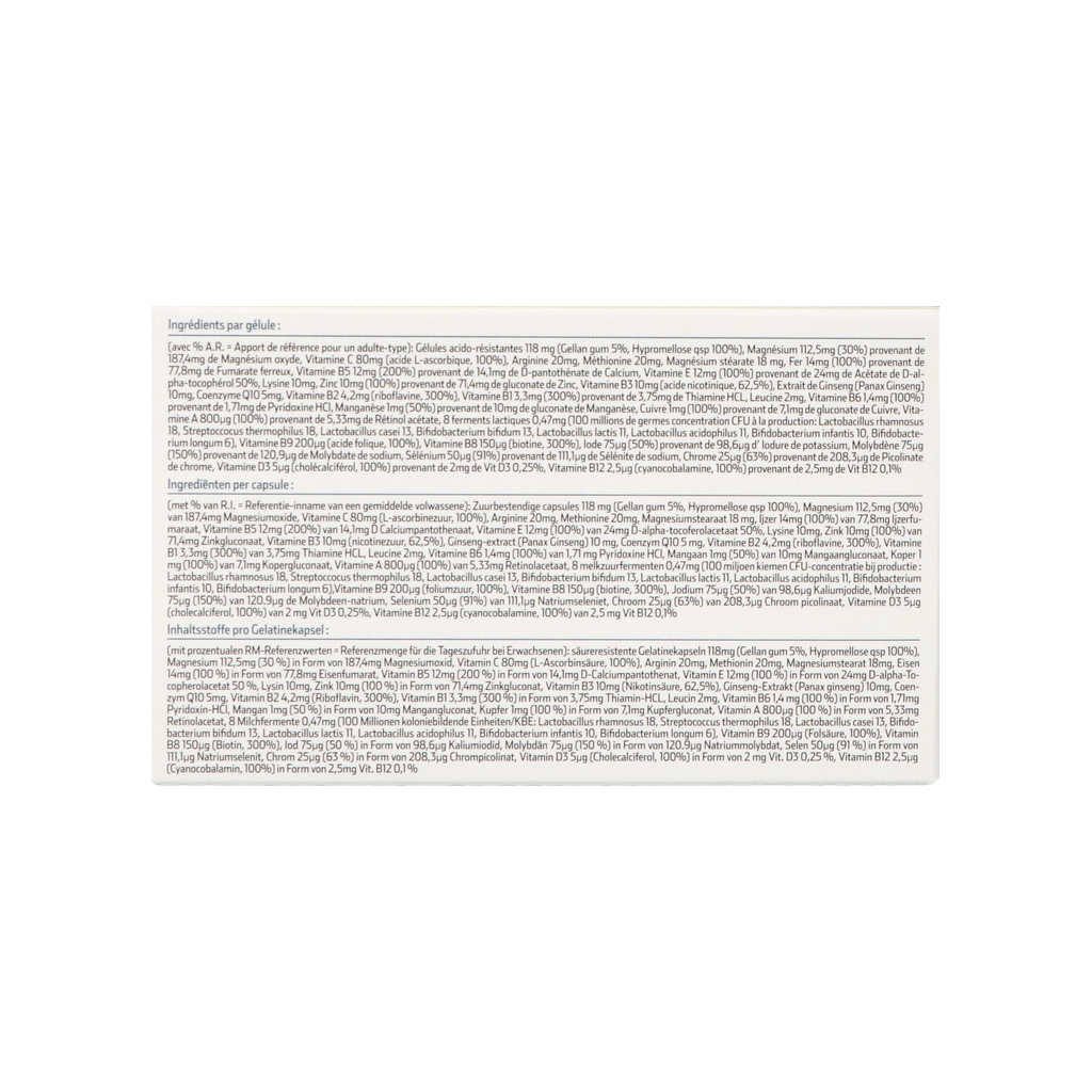 (avec % A.R. = Apport de référence pour un adulte-type): Gélules acido-résistantes 118 mg (Gellan gum 5%, Hypromellose qsp 100%), Magnésium 112,5mg (30%) provenant de187,4mg de Magnésium oxyde, Vitamine C 80mg (acide L-ascorbique, 100%), Arginine 20mg, Méthionine 20mg, Magnésium stéarate 18 mg, Fer 14mg (100%) provenant de77,8mg de Fumarate ferreux, Vitamine B5 12mg (200%) provenant de 14,1mg de D-pantothénate de Calcium, Vitamine E 12mg (100%) provenant de 24mg de Acétate de D-alpha-tocophérol 50%, Lysine 10mg, Zinc 10mg (100%) provenant de 71,4mg de gluconate de Zinc, Vitamine B3 10mg (acide nicotinique, 62,5%), Extrait de Ginseng (Panax Ginseng)10mg, Coenzyme Q10 5mg, Vitamine B2 4,2mg (riboflavine, 300%), Vitamine B1 3,3mg (300%) provenant de 3,75mg de Thiamine HCL, Leucine 2mg, Vitamine B6 1,4mg (100%)provenant de 1,71mg de Pyridoxine HCl, Manganèse 1mg (50%) provenant de 10mg de gluconate de Manganèse, Cuivre 1mg (100%) provenant de 7,1mg de gluconate de Cuivre, VitamineA 800μg (100%) provenant de 5,33mg de Rétinol acétate, 8 ferments lactiques 0,47mg (100 millions de germes concentration CFU à la production: Lactobacillus rhamnosus18, Streptoccocus thermophilus 18, Lactobacillus casei 13, Bifidobacterium bifidum 13, Lactobacillus lactis 11, Lactobacillus acidophilus 11, Bifidobacterium infantis 10, Bifidobacteriumlongum 6), Vitamine B9 200μg (acide folique, 100%), Vitamine B8 150μg (biotine, 300%), Iode 75μg (50%) provenant de 98,6μg d' Iodure de potassium, Molybdène 75μg(150%) provenant de 120,9μg de Molybdate de sodium, Sélénium 50μg (91%) provenant de 111,1μg de Sélénite de sodium, Chrome 25μg (63%) provenant de 208,3μg de Picolinatede chrome, Vitamine D3 5μg (cholécalciférol, 100%) provenant de 2mg de Vit D3 0,25%, Vitamine B12 2,5μg (cyanocobalamine, 100%) provenant de 2,5mg de Vit B12 0,1%