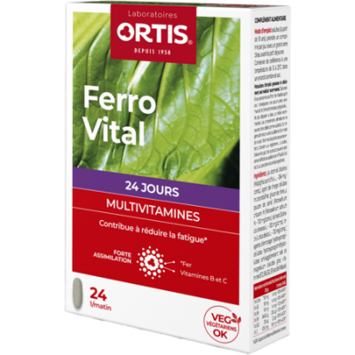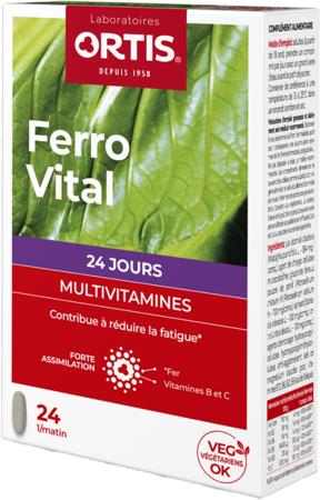 Ortis Ferro Vital Plus est un complément alimentaire contenant un fer particulièrement assimilable et qui couvre 100 % des besoins en fer, vitamine C, B2, B6, B12 et en acide folique. Ortis Ferro Plus est conseillé pour les adolescents en pleine croissance, les femmes, les femmes enceintes, les sportifs et les végétariens.