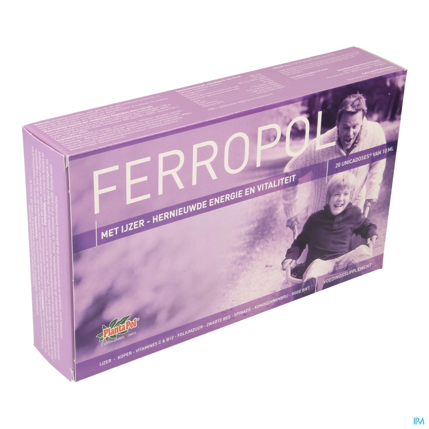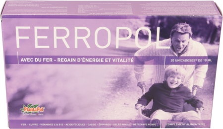 Ferropol a une composition unique et une formule concentrée qui fournit un ajout de fer. La composition de Ferropol a été étudiée pour optimiser l'absorption du fer par l'organisme. La formule est complétée par de la vitamine C (augmente l'absorption du fer) et du cuivre (transporte le fer vers les tissus).