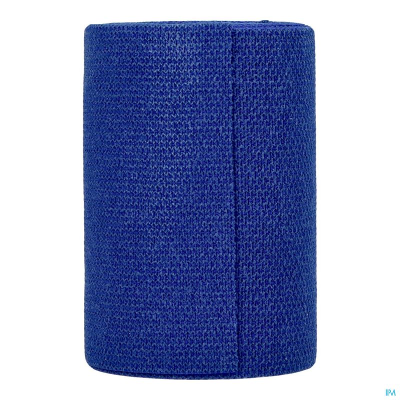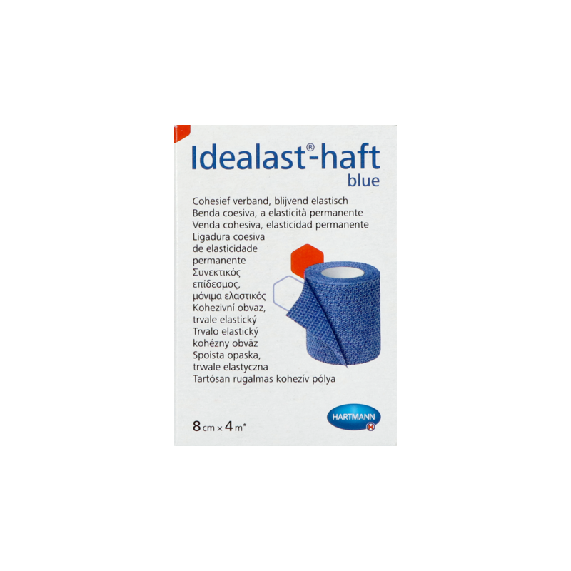 Bandage élastique de couleur bleue.Idealast®-haft est un bandage cohésif durablement élastique, à allongementcourt, d'une extensibilité de 90 % environ, l'effet cohésif des deux faces assure l'ajustement parfait du bandage, une bonne pression de travail et une faible pression au repos ; le bandage blanc radiotransparent est perméable l'air et stérilisable (vapeur à 134°C).
