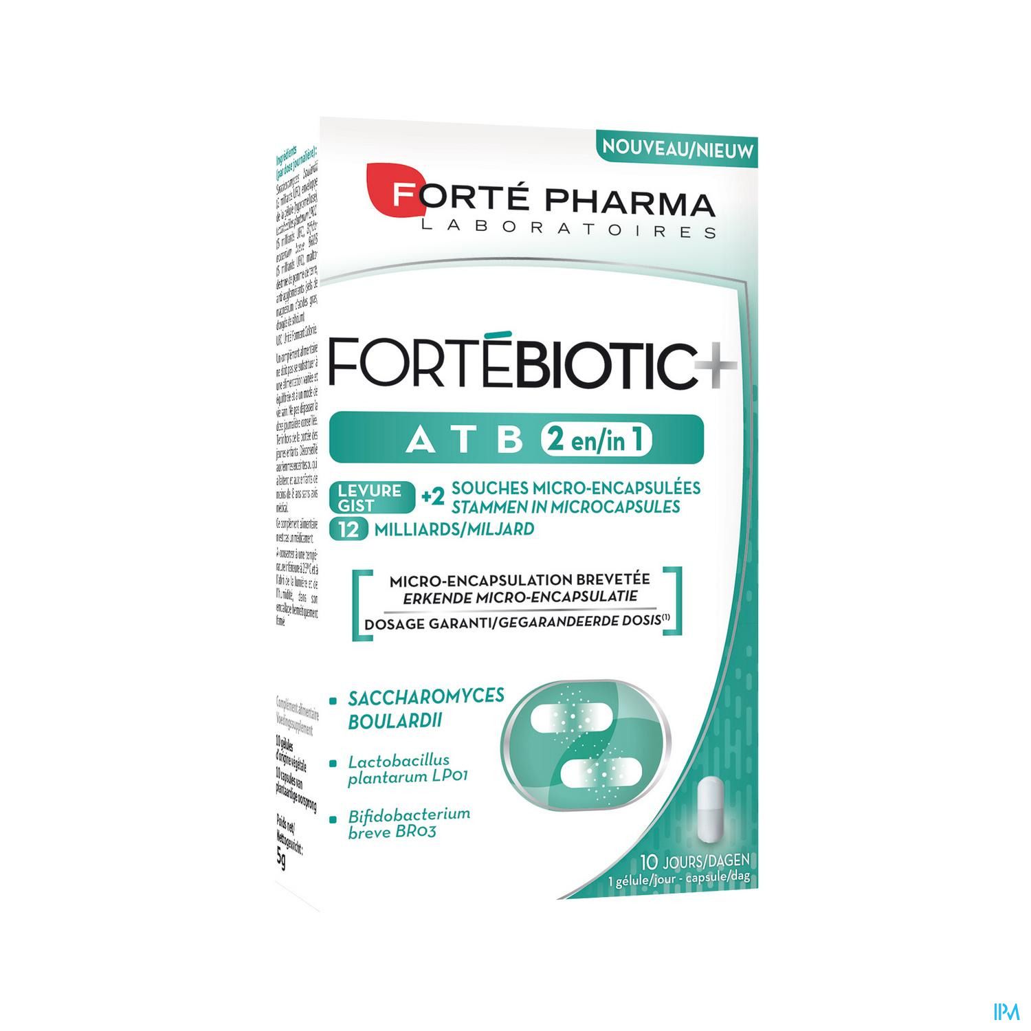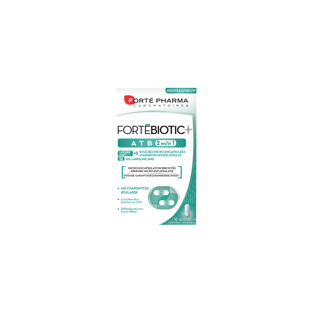 La formule unique et innovante FortéBiotic+ ATB 2 en 1 associe 2 souches micro-encapsulées (10 milliards) et une levure spécifique, Saccharomyces boulardii (2 milliards), qui agissent ensemble.