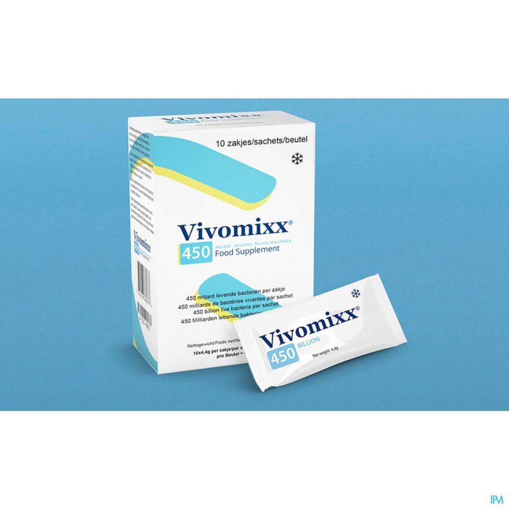 Vivomixx est un complément alimentaire microbiotique à haute puissance contenant 8 souches de bactéries vivantes à des concentrations de 450 milliards de bactéries par sachet.