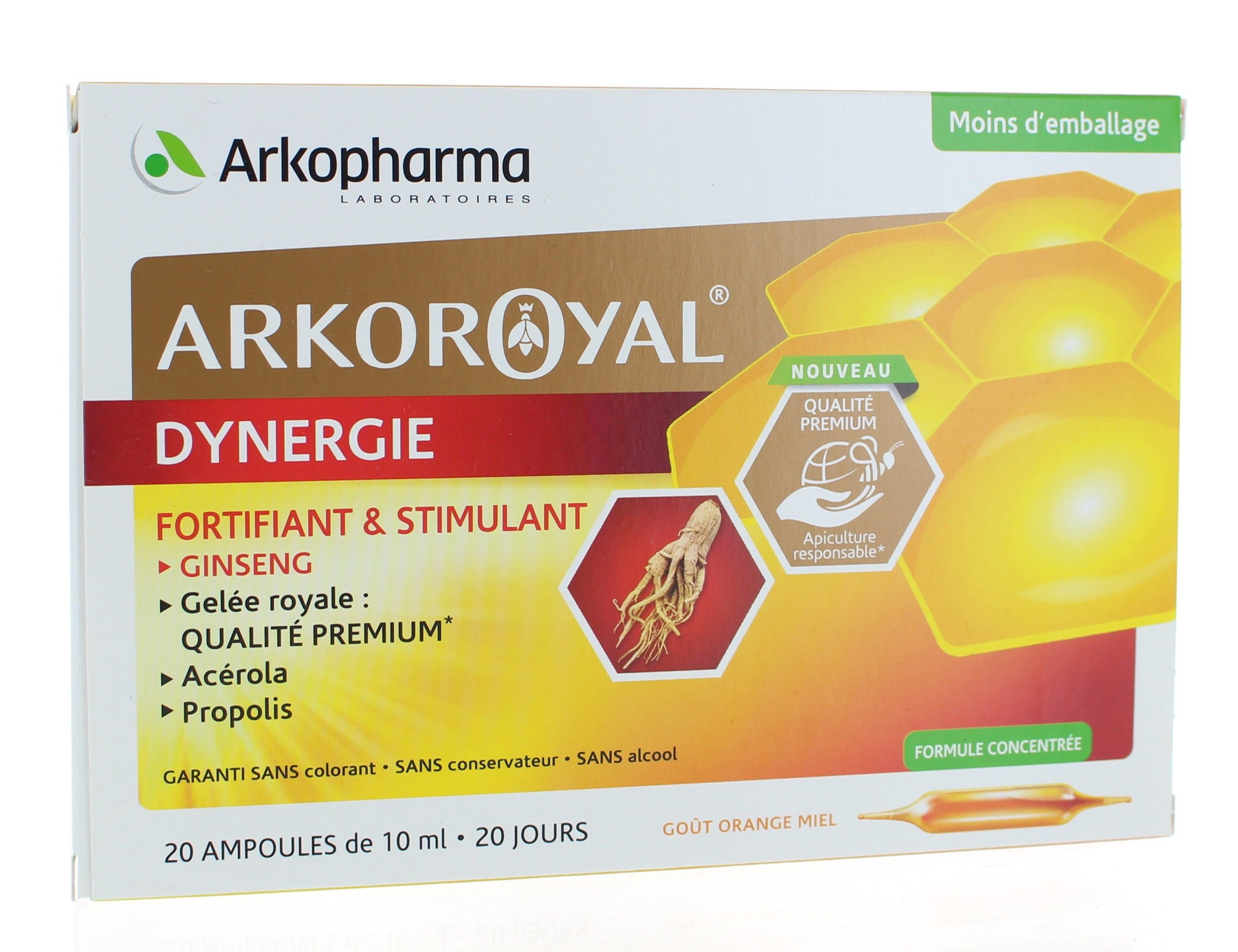 Arkoroyal Dynergie est un complément alimentaire fortifiant et stimulant à base de ginseng, de gelée royale, d'acérola et de propolis.