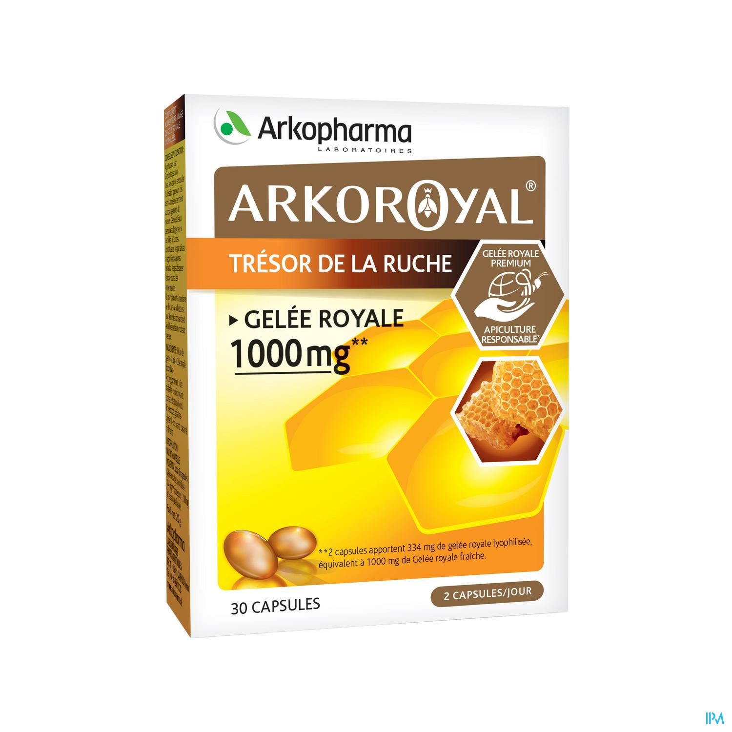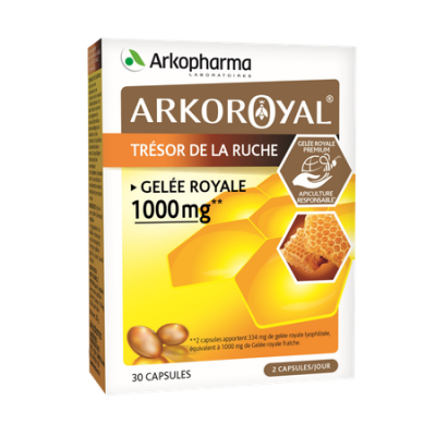 Arkoroyal® Capsule Gelée Royale est la 1er format capsule de la gamme associant un fort dosage par prise pour un soucis de facilité et praticité ! Elle apporte 1000 mg de gelée royale lyophilisée par prise de 2 capsules par jour. Il est conseillé à l'entrée de l'hiver mais aussi lors des changements de saisons.