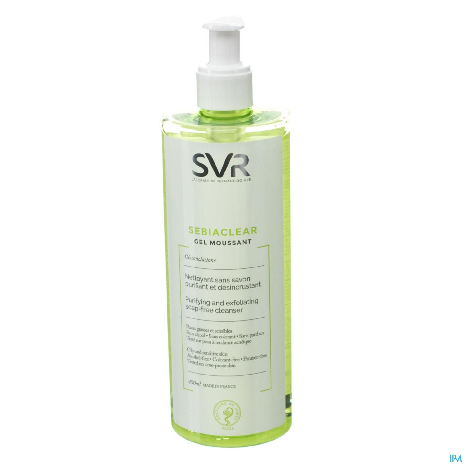 SVR Sebiaclear gel moussant est un gel nettoyant sans savon purifiant et désincrustant. Le gel Sebiaclear convient pour les peaux grasses et sensibles. Sans alcool, sans colorant, sans paraben, testé sur peau à tendance acnéique.
