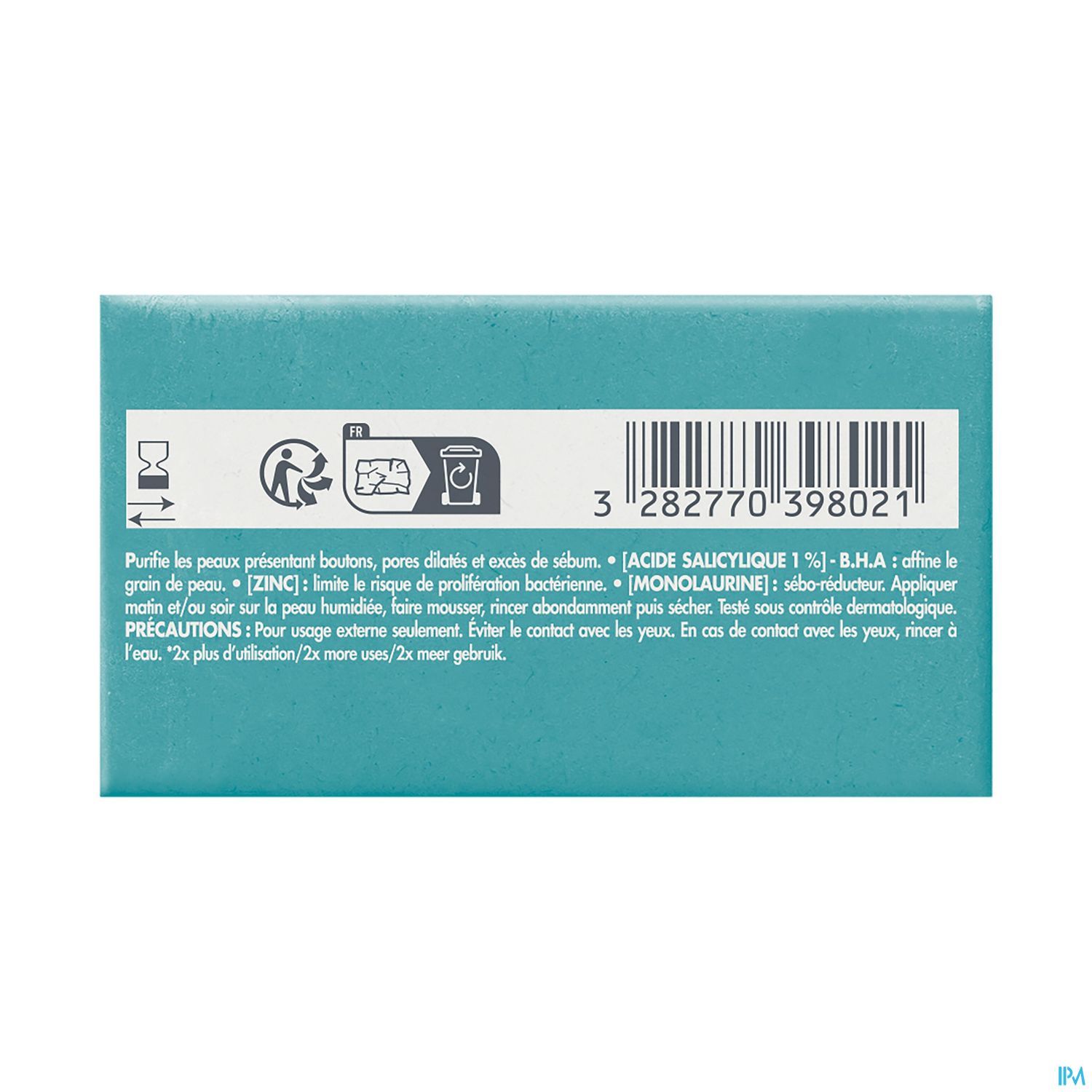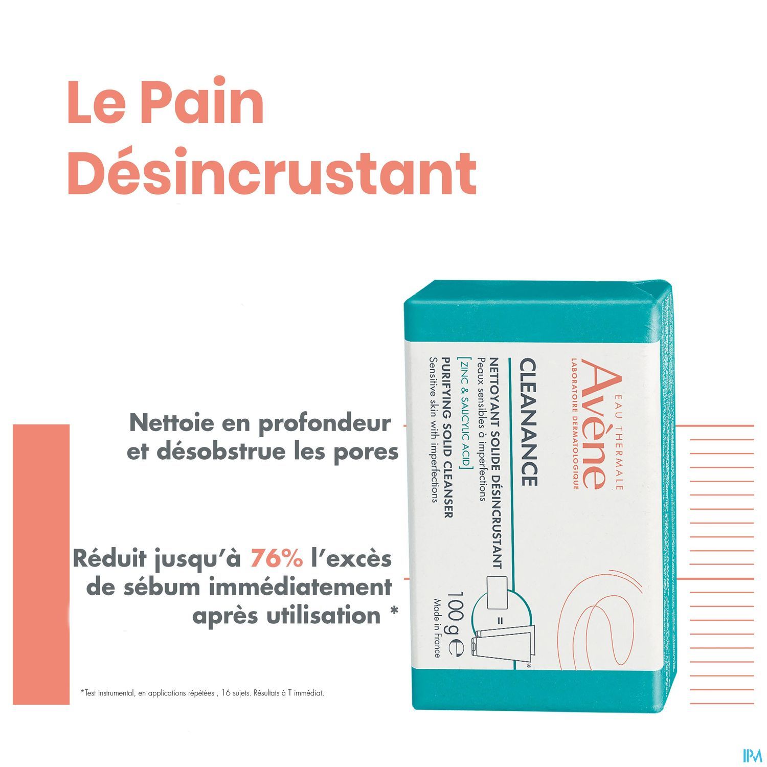 Le nettoyant solide désincrustant est conçu spécifiquement pour l'hygiène quotidienne des peaux grasses et à tendance acnéique. Grâce à son format solide, il offre deux fois plus d'utilisation qu'un gel nettoyant 200ml et nettoie en profondeur pour réduire la brillance, l'excès de sébum et limiter les imperfections. Grâce à son trio d'actifs purifiants - acide salicylique, monolaurine et zinc - il désobstrue les pores. Sa mousse onctueuse et délicate enrichie en Eau thermale d'Avène nettoie sans dessécher, et laisse sur la peau une agréable sensation de propreté sur la peau.