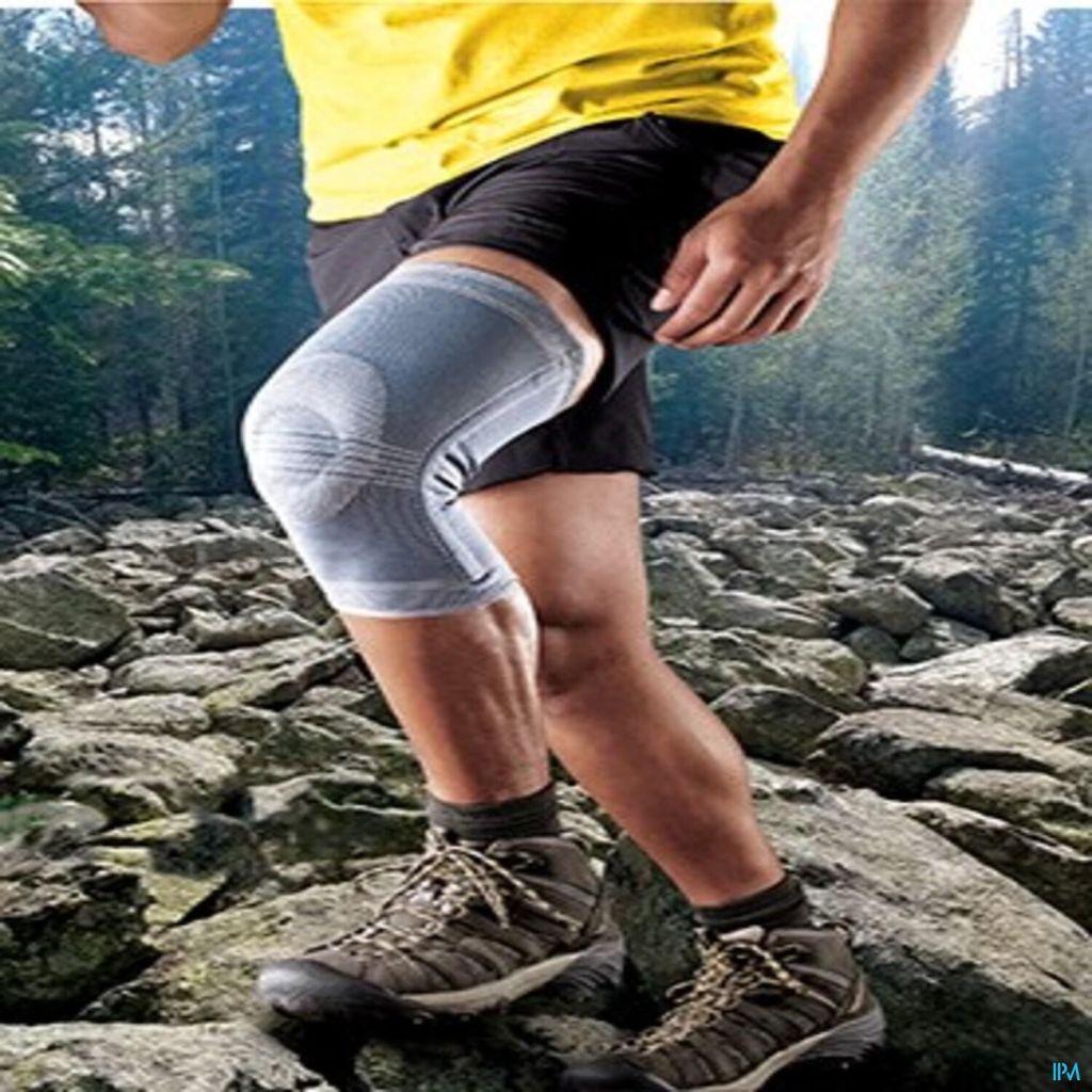 Genouillère – sans ouverture rotulienne Forme anatomique Tricot multi-élastique (3D) très fort Bords supérieurs et inférieurs extra-souples Maintien latéral par baleinage Guide de silicone entourant la rotule (fermée)