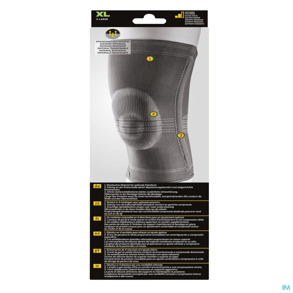 Genouillère – sans ouverture rotulienne Forme anatomique Tricot multi-élastique (3D) très fort Bords supérieurs et inférieurs extra-souples Maintien latéral par baleinage Guide de silicone entourant la rotule (fermée)