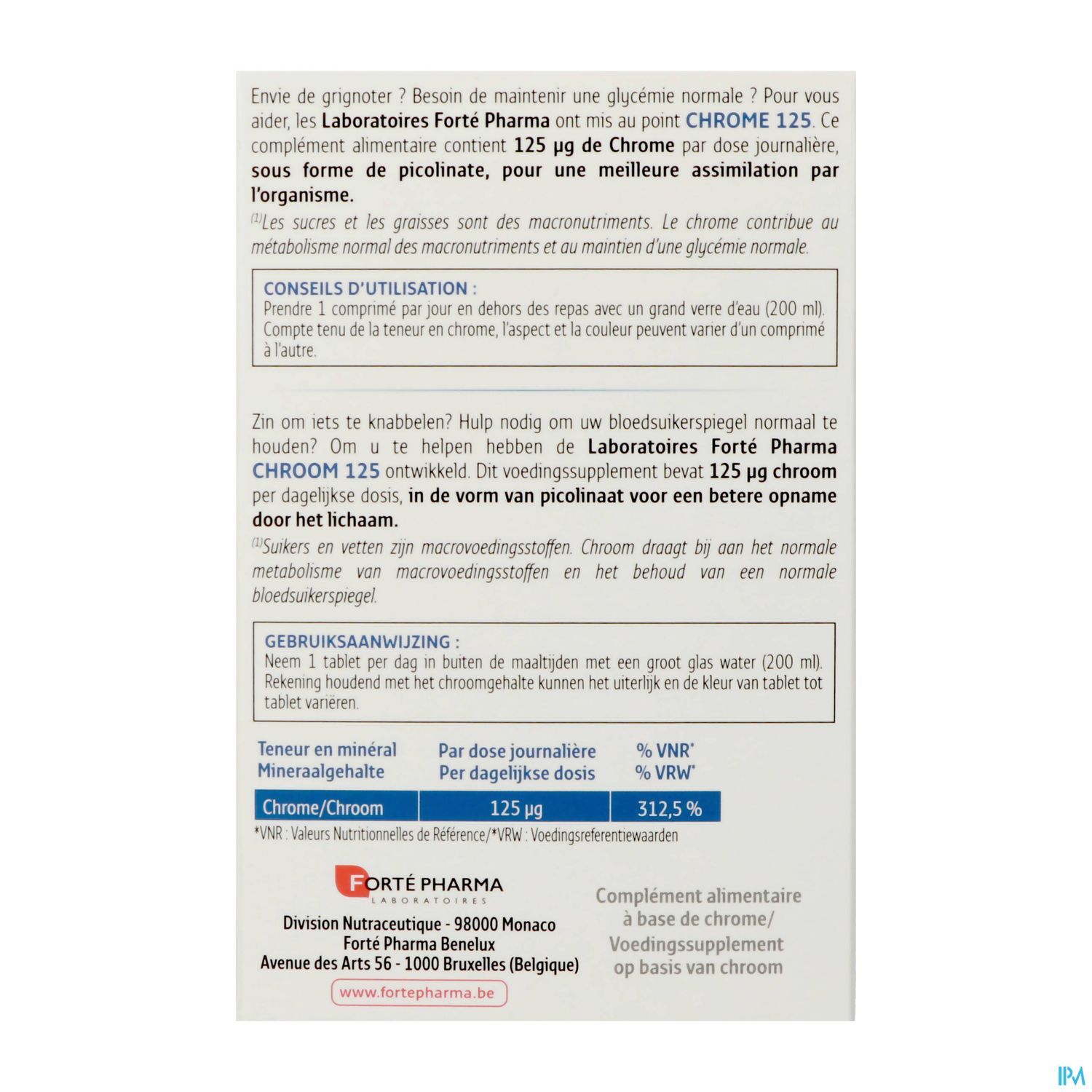 Pour vous aider, les Laboratoires Forté Pharma ont mis au point CHROOM 125. Ce complément alimentaire contient 125µg de chrome par dose journalière, sous forme de picolinate pour une meilleure absorption par l'organisme.
