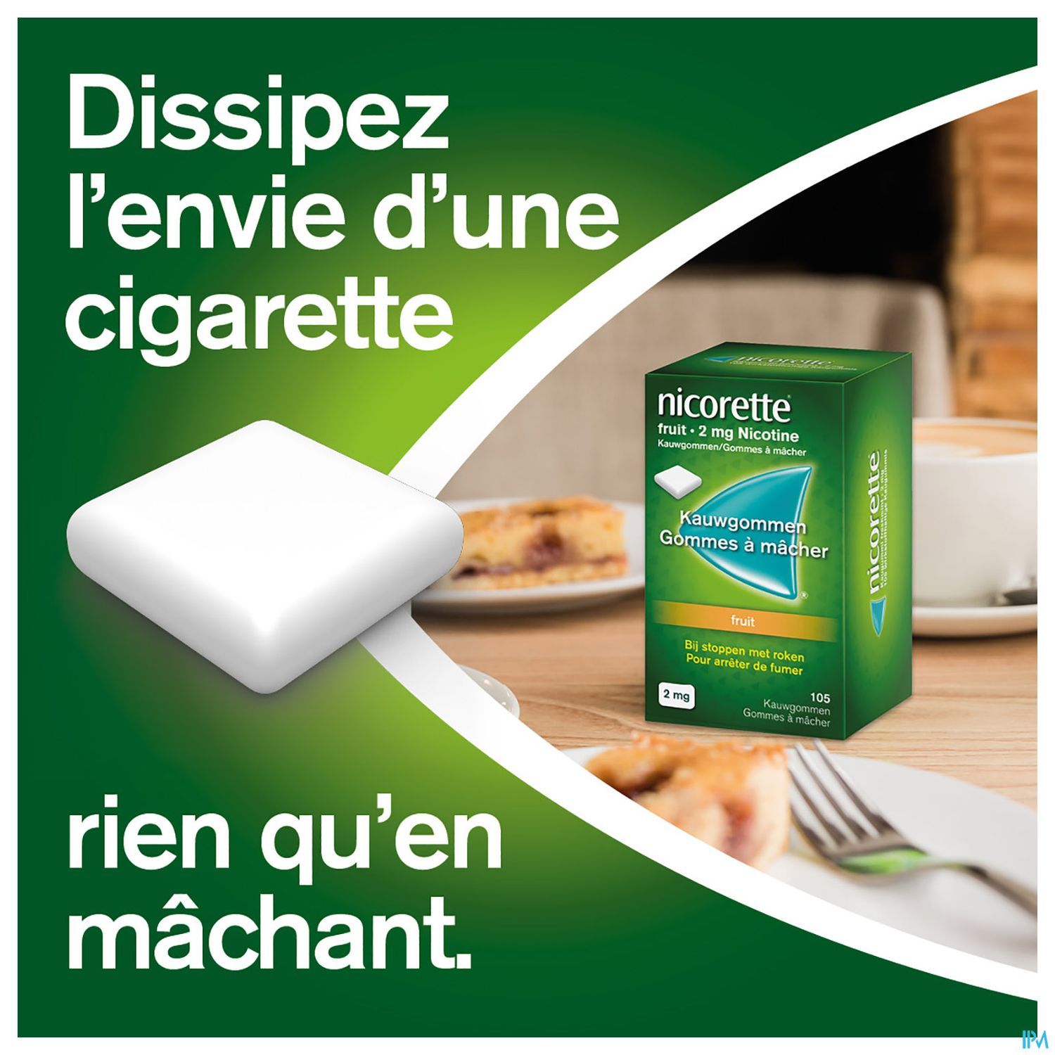 Nicorette® Fruit Gomme à Mâcher est destiné aux moments où vous voulez réprimer votre envie de fumer. Nicorette® Fruit Gomme à Mâcher est une méthode efficace pour arrêter de fumer, tant immédiatement que progressivement. La nicotine contenue dans la gomme est à usage thérapeutique et suffit à maîtriser vos symptômes de sevrage. Pour se défaire de l'habitude de fumer, un traitement d'au moins trois mois est recommandé. Vous réduisez progressivement vos besoins et pouvez arrêter lorsque 1 à 2 gommes à mâcher par jour suffisent. Utilisez Nicorette® Fruit Gomme à Mâcher en association avec Nicorette® Invisi Patch si vous êtes un gros fumeur, si vous souffrez d'envies récurrentes et incontrôlables de fumer, ou si une autre thérapie de remplacement de la nicotine n'a pas donné de résultats suffisants auparavant. Nicorette® Invisi Patch est un patch discret qui réprime vos envies de nicotine pendant 16 heures. Combinez-le avec votre volonté et Nicorette® Fruit Gomme à Mâcher et faites un pas important vers une vie sans tabac.