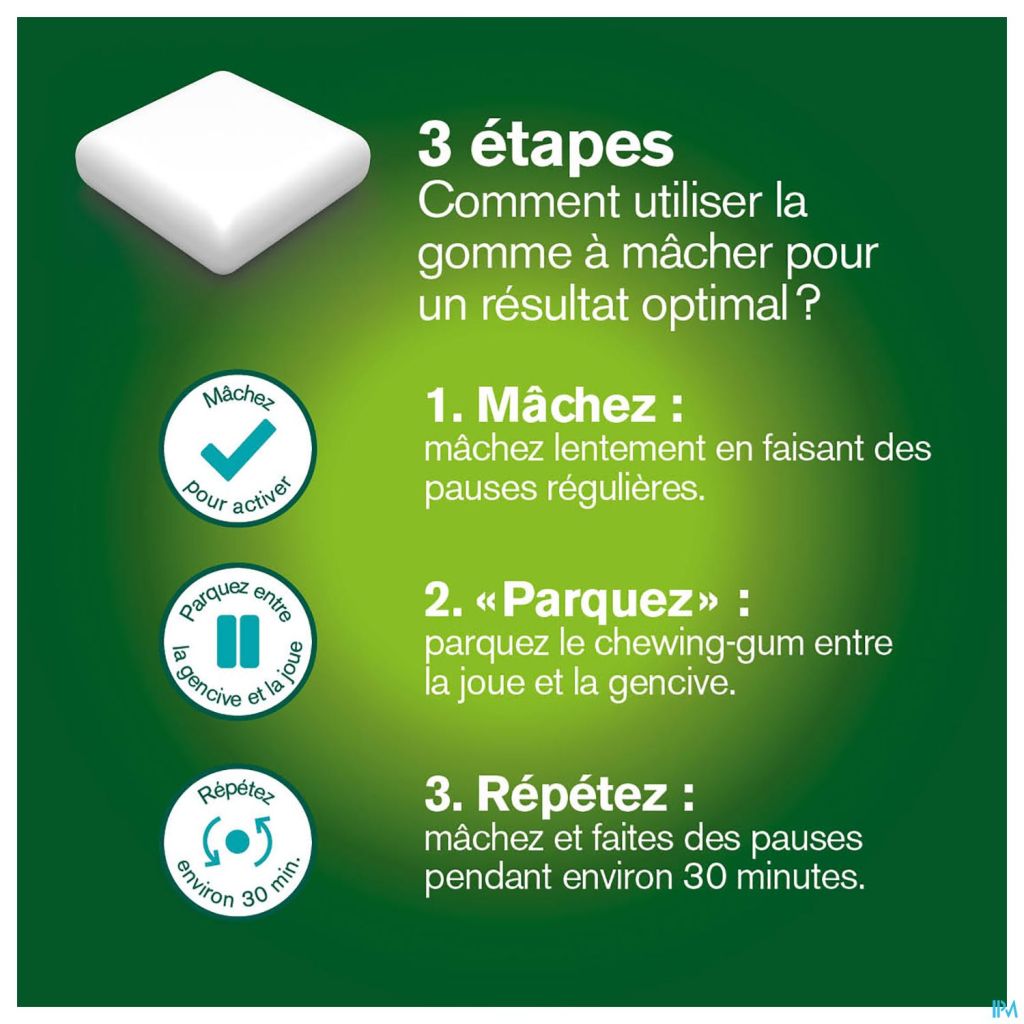 Mâchez lentement pendant 10 secondes, puis laissez reposer la gomme à mâcher Nicorette® Fruit entre les gencives et la joue pendant une minute. Répétez l'opération pendant environ trente minutes.