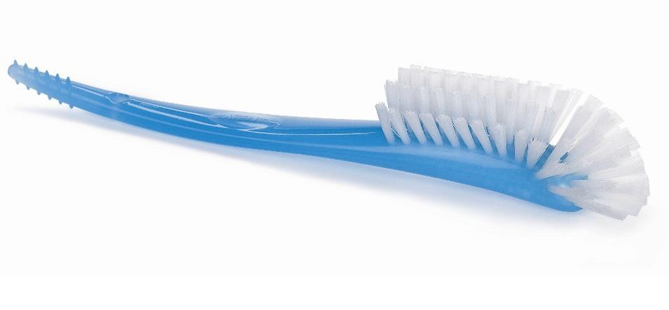 Brosse à bout recourbé et extrémité de manche moulée pour un nettoyage méticuleux de tous types de biberons à col large, tétines et autres accessoires d'allaitement.