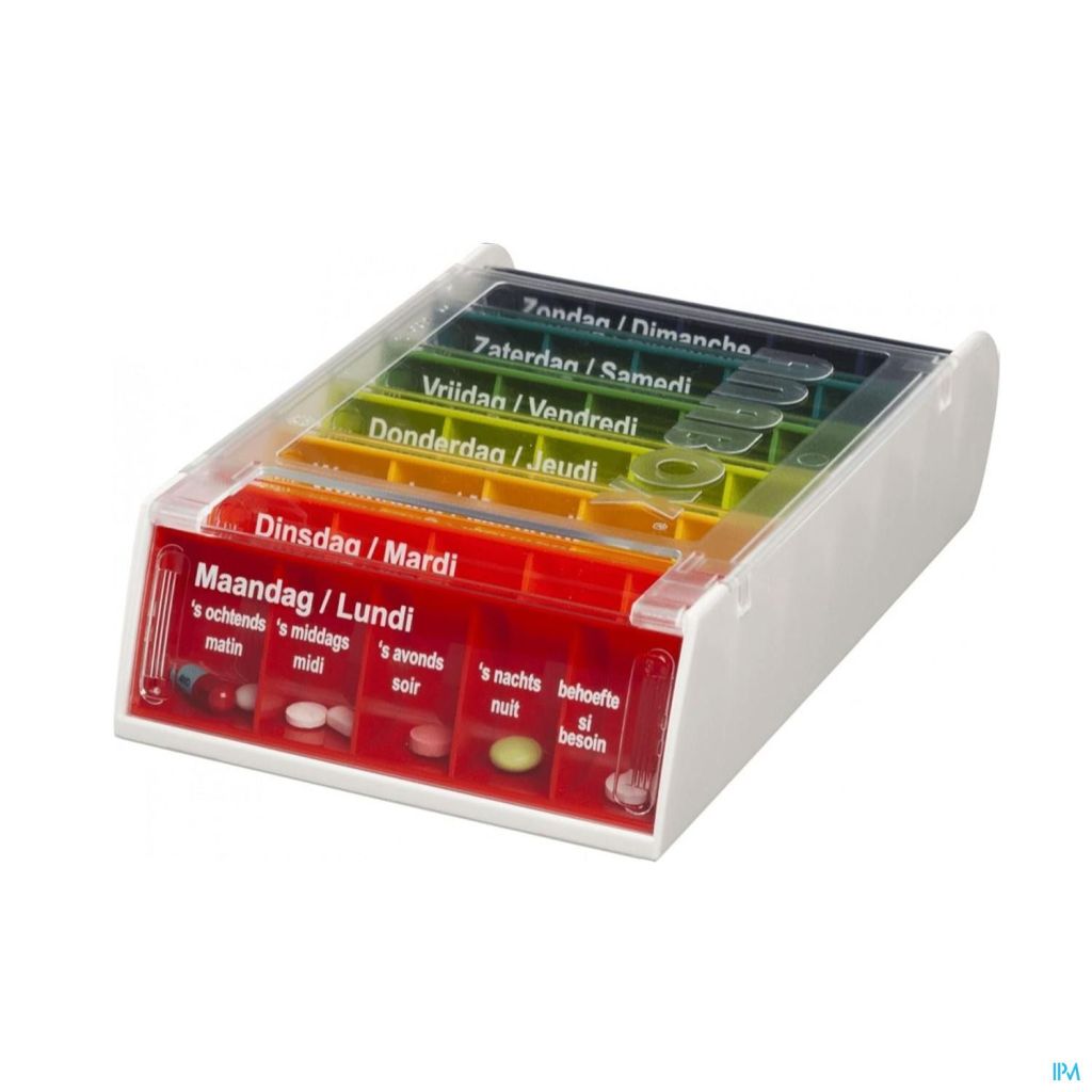 Chaque boîte de jour comporte cinq compartiments. Ces compartiments sont divisés en matinée, après-midi, soirée, nuit et selon les besoins. L'Anabox se décline dans des couleurs arc-en-ciel saisissantes, va au lave-vaisselle et comporte un texte en français et en néerlandais.