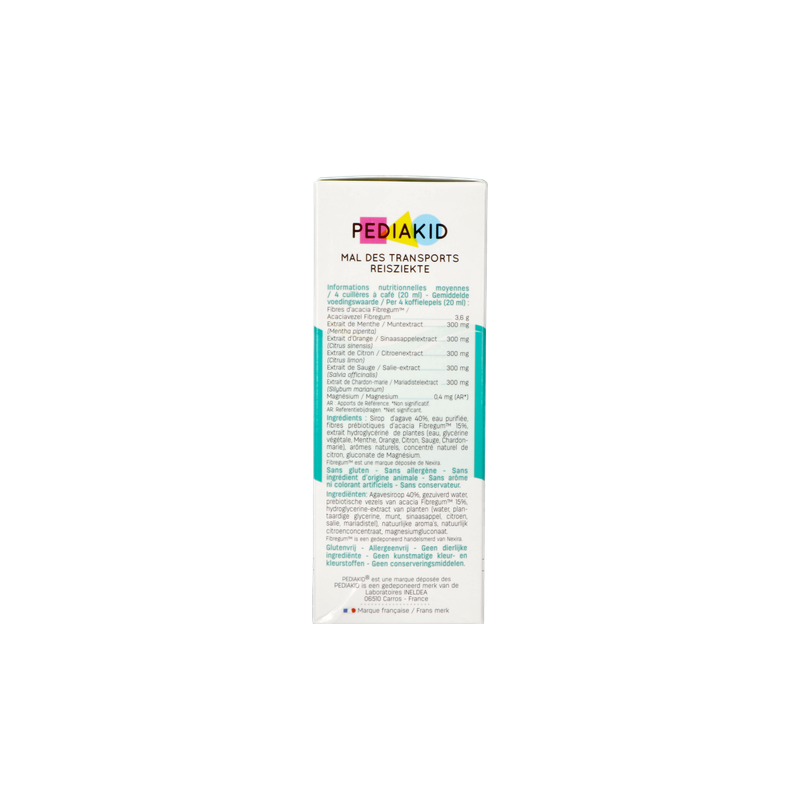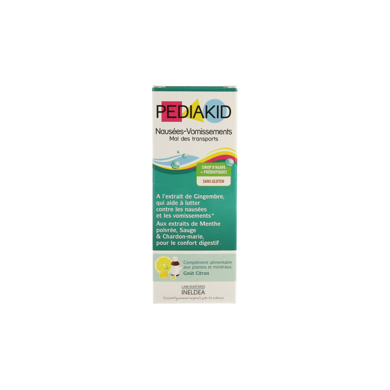 Dès lors que l'alimentation est diversifiée.Le + produit : Une innovation exclusive : Le Nectar d'AgavePlus doux et moins épais que le miel, ce sucre d'origine végétale fabriqué au Mexique est contenu dans toutes les formulations PEDIAKID® Sirops. Il est constitué de sucres naturels, non raffinés, ce qui lui confère des qualités nutritionnelles spécifiques.Complément alimentaire sous forme de sirop à base d'extraits de Gingembre, Menthe, Sauge, Chardon-marie, Citron, Orange et Magnésium.PEDIAKID® Nausées-Vomissements Mal des transports associe des principes actifs naturels pour lutter contre les nausées et vomissements de courte durée, associés notamment au mal des transports. Il renferme du Gingembre traditionnellement reconnu pour soulager les nausées, mais aussi du Chardon-marie, de la Sauge et de la menthe, qui participent au confort digestif. Recommandé lors d'épisodes de nausées ou vomissements. Idéal durant les trajets quotidiens en voiture ou lors des départs en vacances (bateau, avion…).PEDIAKID® Nausées-Vomissements Mal des transports est élaboré sans gluten, sans allergène, sans ingrédient d'origine animale, sans OGM, sans arôme artificiel et sans conservateur.Conseils d'utilisation : Dès lors que l'alimentation est diversifiée