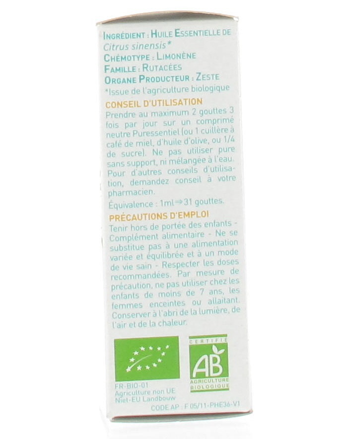 Ingrédient : huile essentielle de citrus sinensis*Chémotype : limonène Famille : rutacées