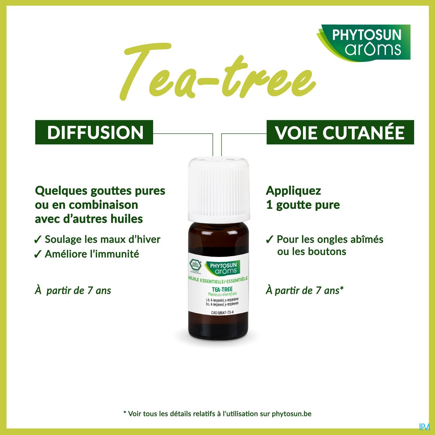 Soulagez la gorge irritée : Appliquez 2 gouttes de Tea tree sur un support neutre. A répéter 3 x par jour, pendant 7 jours au max.
