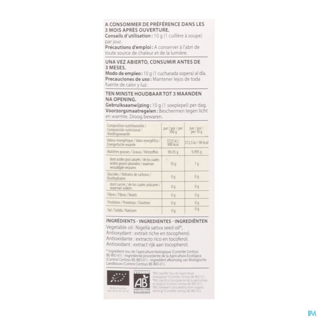 Conseils: Usage oral :10 g (1 cuillère à soupe) par jour. Aide à renforcer les défenses naturelles de l'organisme. Favorise la digestion. Source d'acides gras essentiels.