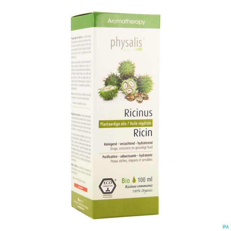 Physalis bio L'huile de ricin est une huile jaune pâle, visqueuse, extraite des graines du ricin ou "arbre miracle". Elle est également appelée huile de ricin et est très riche (jusqu'à 90%) en glycérides d'acide ricinoléique (ω9).