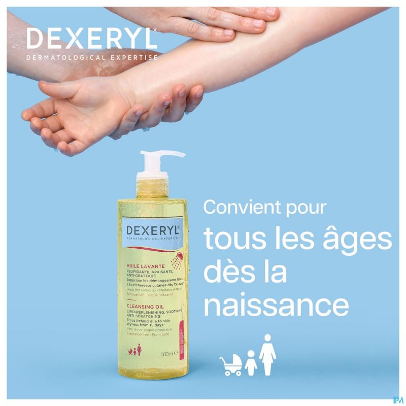 Les peaux sèches ou atopiques peuvent être irritées par les savons et l'eau. L'huile lavante DEXERYL est spécialement conçue pour nettoyer en douceur, apaiser et relipider la peau sèche, très sèche ou à tendance atopique tout en préservant la barrière cutanée. Elle supprime 100% des démangeaisons , liées à la sécheresse cutanée, en 15 jours, hydrate et relipide les peaux de toute la famille. Sa formule sans parfum et sans savon est utilisable dès la naissance. Sa texture fluide est agréable à appliquer, et produit une mousse légère et douce sur la peau, facile à rincer.