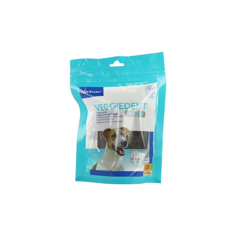 VeggieDent des laboratoires Virbac sont des lamelles végétales à mâcher pour les chiens de 0 à 10 kg qui contribuent à réduire la plaque dentaire et la formation de tartre et, par conséquent, favorise une haleine fraîche.