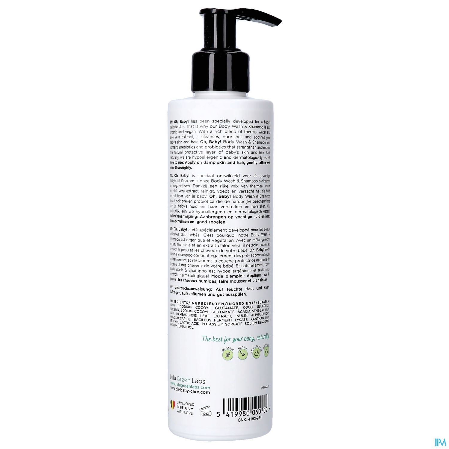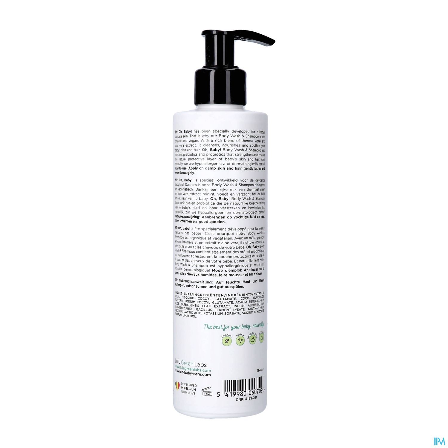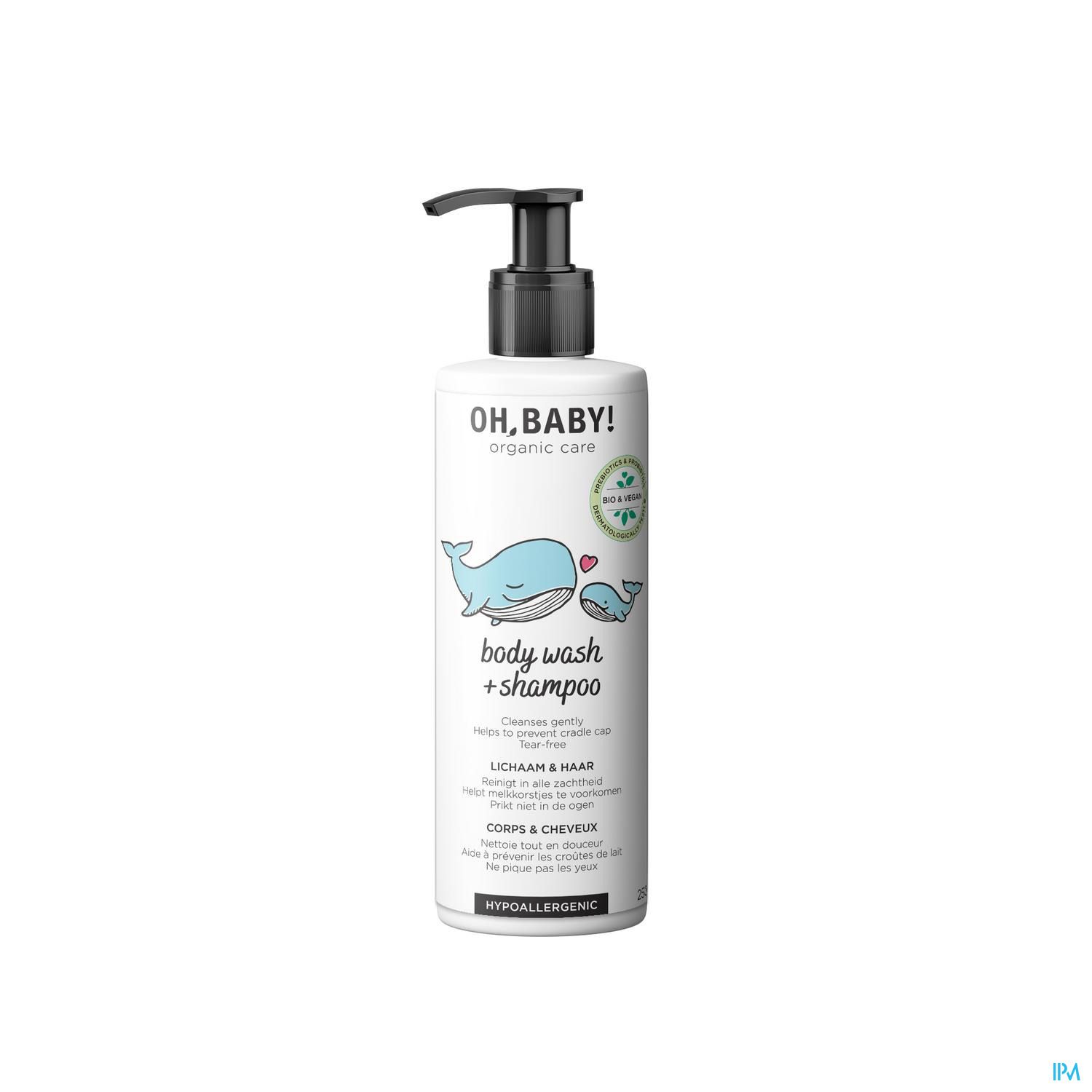 Grâce au riche mélange d'eau thermale et d'extrait d'aloe vera, notre gel douche et shampooing sans savon, biologique et végétalien, nettoie, nourrit et adoucit le corps et les cheveux de votre bébé. Oh, Baby ! contient également des prébiotiques et des probiotiques qui renforcent et restaurent la couche protectrice naturelle de la peau et des cheveux de votre bébé.