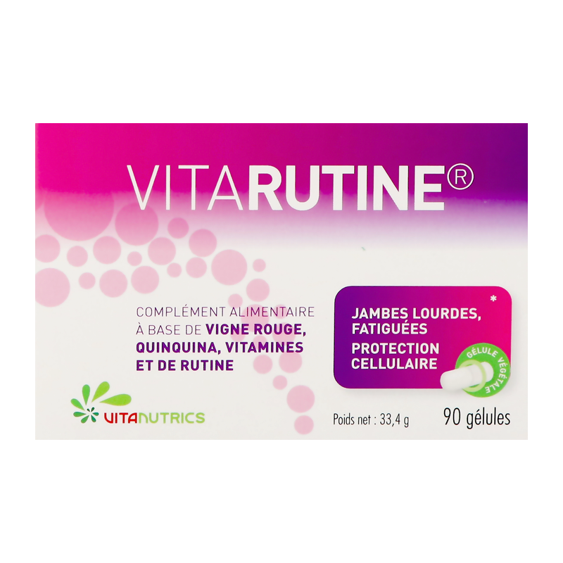 Extrait de Vigne rouge (Vitis vinifera), extrait de Quinquina rouge (Cinchona pubescens) à 5% de quinine, enrobage : gélule végétale (HPMC), rutine (10%), vitamine C, vitamine E, antiagglomérant : sels de magnésium d'acides gras.