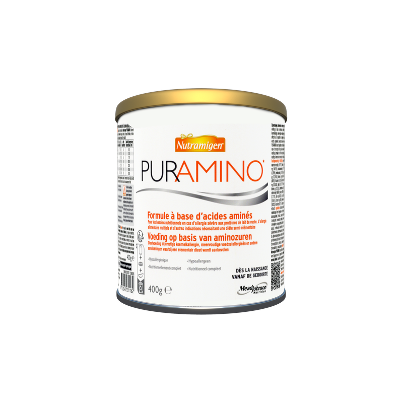 Nutramigen* PURAMINO* est une formule hypoallergénique à base d'acides aminés libres qui est utilisée comme aliment diététique pour les nourrissons et les enfants souffrant d'allergie sévère au lait de vache et d'allergies alimentaires multiples. Nutramigen* PURAMINO* peut être utilisé comme seule source d'alimentation de la naissance à 6 mois. Il peut également être utilisé dans le cadre d'une alimentation variée à partir de 6 mois.