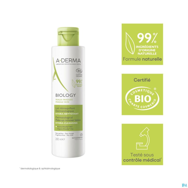 Avec BIOLOGY LAIT DÉMAQUILLANT DERMATOLOGIQUE HYDRA-NETTOYANT, A-DERMA a mis au point le premier lait démaquillant dermatologique et certifié BIO qui s'adapte à toutes les peaux fragiles du visage. Sa formule innovante renferme l'actif phare de la gamme BIOLOGY, la Sève* d'Avoine Rhealba® BIO connue pour ses propriétés rééquilibrantes et hydratantes, ainsi que de l'Extrait de Florin d'Or connu pour ses propriétés anti-pollution. Lacté et non collant, ce LAIT DÉMAQUILLANT dermatologique, sans rinçage et testé sur les peaux allergiques, s'utilise sur le visage et le contour des yeux. Il démaquille et nettoie avec une extrême douceur, hydrate et rééquilibre les peaux fragiles. Sans parfum ni huile essentielle et non comédogène, sa formule à 99 % d'origine naturelle est certifiée BIO. Avec BIOLOGY LAIT DÉMAQUILLANT DERMATOLOGIQUE, A-DERMA offre aux peaux fragiles, une hygiène qui ne comprend que les ingrédients essentiels pour assurer une tolérance optimale.Avoine Rhealba® issue de l'agriculture biologique. Info Vegan : sans ingrédient d'origine animale.