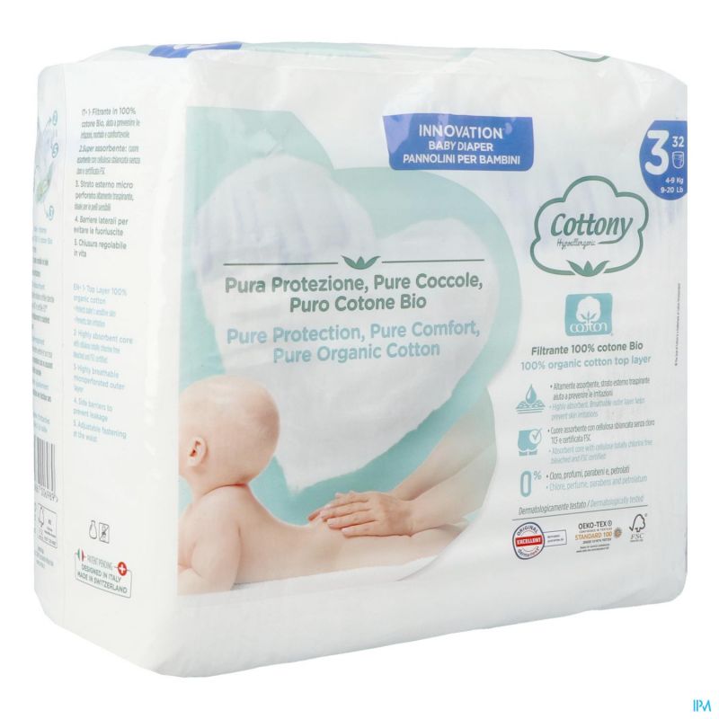 La ligne Cottony est née de l'expérience de l'entreprise familiale italienne Corman SpA. Après des années de recherche, la ligne propose aujourd'hui des couches innovantes dont la couche supérieure, en contact avec la peau de l'enfant, est en coton 100 % biologique, extrêmement doux et délicat. Une fibre qui aide à prévenir les irritations et qui est donc idéale pour les peaux sensibles des bébés ; très absorbante grâce à l'âme en duvet de cellulose TCF (totally chlorine-free), blanchie sans chlore, respirante et inodore, testée dermatologiquement.