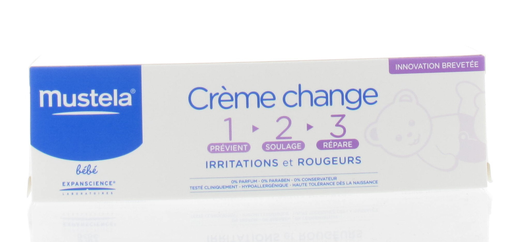 Mustela crème pour le change 1 2 3 des laboratoires Expanscience prévient, soulage et répare les irritations et rougeurs. Haute tolérance prouvée sur peaux hypersensibles. Sans parfum. Sans paraben. Sans conservateur. Hypoallergénique.