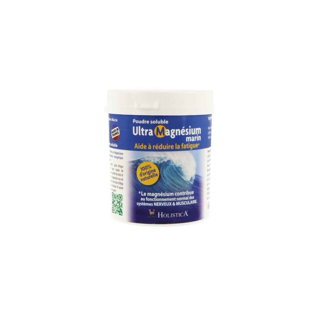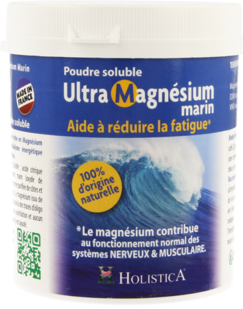Ultra Magnésium Marin est une poudre soluble à base de magnésium marin qui aide à réduire la fatigue. Le magnésium contribue au fonctionnement normal des systèmes nerveux et musculaires.