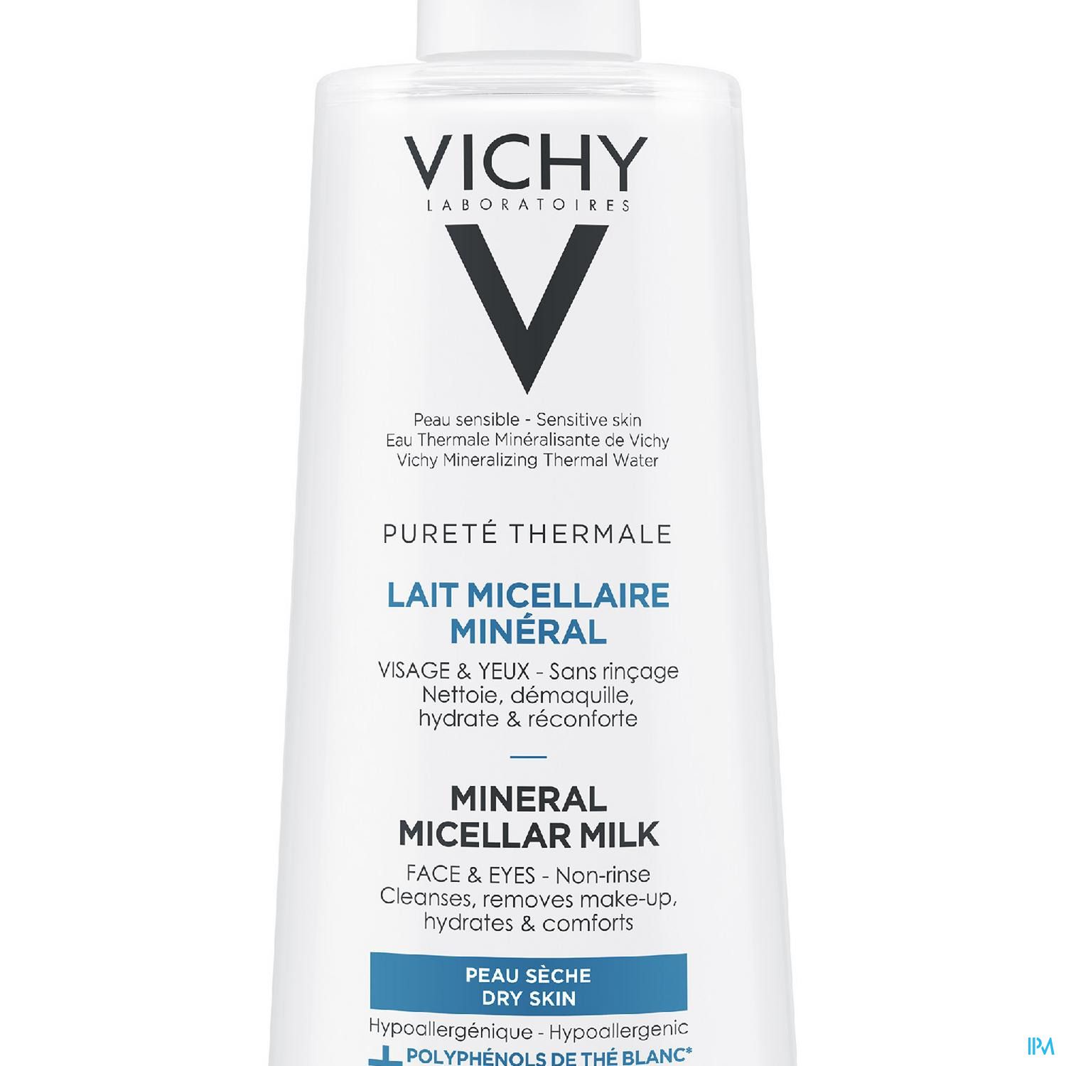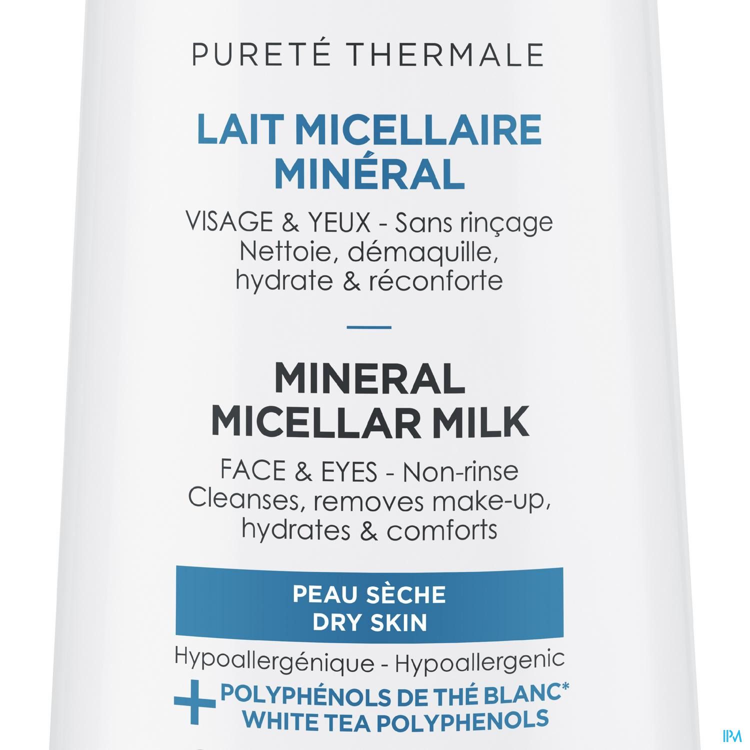 Lait micellaire pour une peau sèche à très sèche combinant l'action d'une eau micellaire avec la douceur d'un lait. Ce lait micellaire démaquille et laisse la peau hydratée, propre et confortable, grâce à la formule contenant de l'eau volcanique de Vichy et des polyphénols de thé blanc.