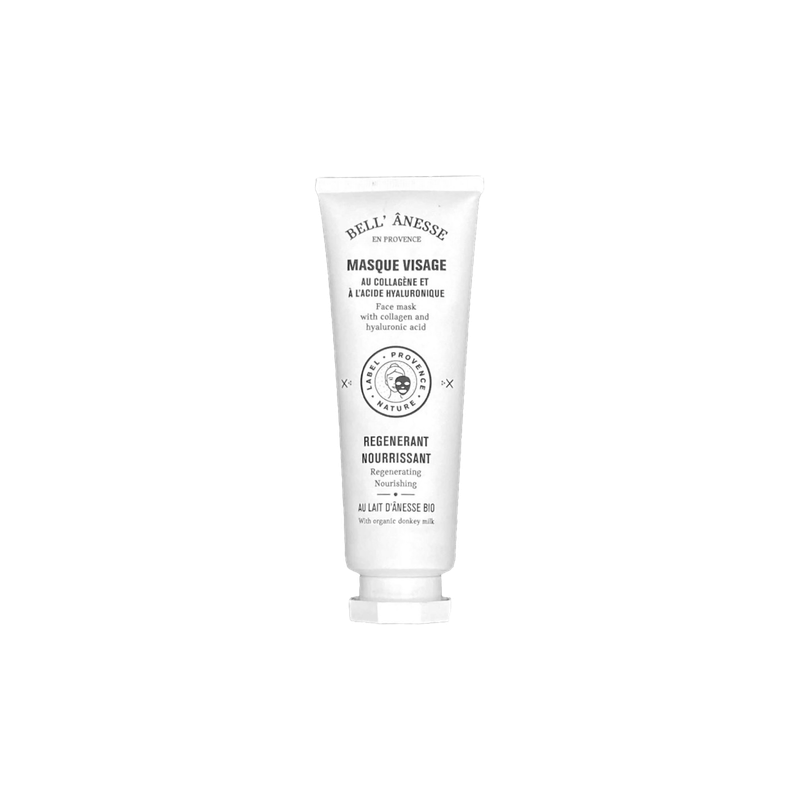 Masque facial régénérant au lait d'ânesse bio, à l'argile blanche et enrichi en collagène et acide hyaluronique.