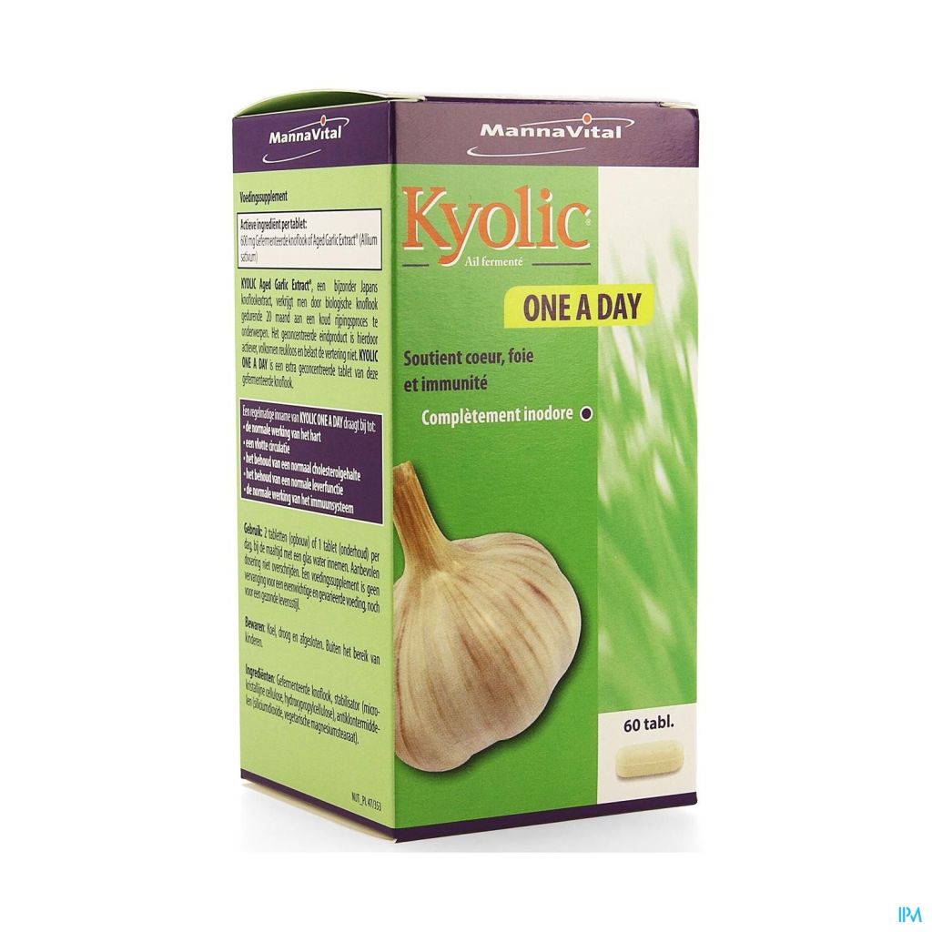 Celui qui veut profiter au maximum de la large action bénéfique sur la santé de l'ail et ce, sans gêne d'odeur, trouve avec KYOLIC Ail fermenté (Aged Garlic Extract®) le complément alimentaire idéal. Grâce aux substances soufrées particulières telles que la S-allylcystéïne , des études scientifiques ont démontré que KYOLIC ONE A DAY soutient la circulation de façon optimale. En outre, son soutien du foie, son action renforçatrice des défenses, protectrice des cellules, et antistress, ont été largement documentées.