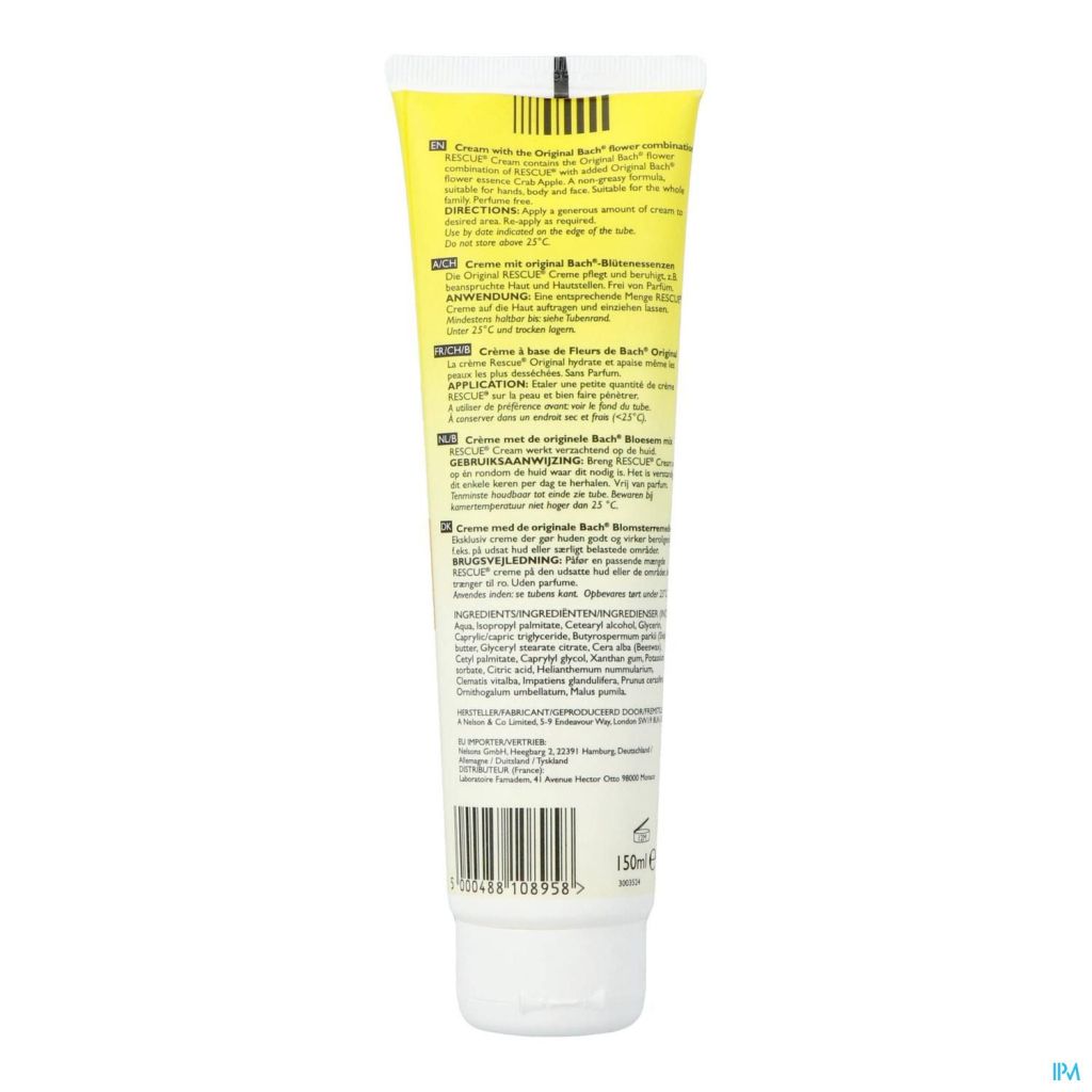 RESCUE® Cream est un premiers secours pour la peau. C'est un baume apaisant conçu à partir d'ingrédients naturels. RESCUE® Cream apaise la peau et réconforte la peau après un bain de soleil trop prolongé, une piqure d'insecte ou après un petit accident lors d'un sport ou en jouant. RESCUE® Cream est aussi un bienfait pour les peaux rugueuses ou rêches et soutient la capacité de régénération de votre peau. Ce produit est une formule originale du Edward Bach. Les remèdes originales de Fleurs de Bach et la gamme Rescue, originaires de Mount Vernon (GB) - la résidence et le lieu du travail du Dr. Bach - se reconnaissent à la signature Bach.