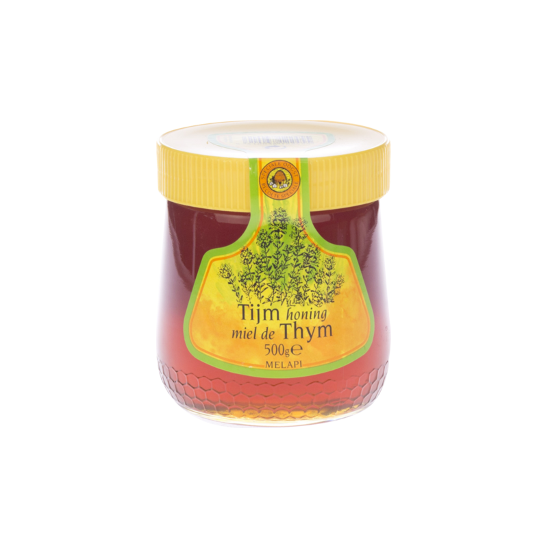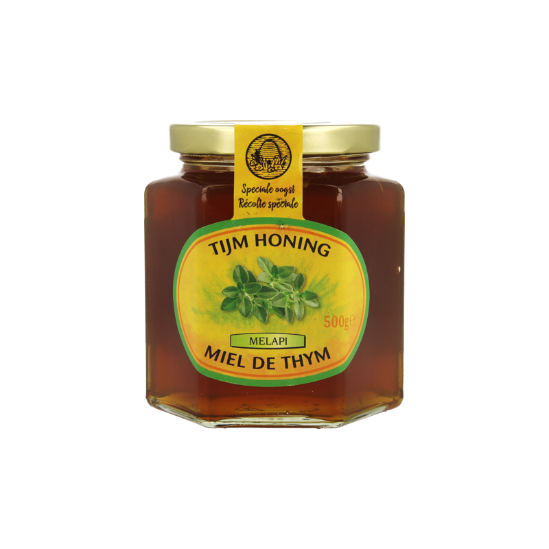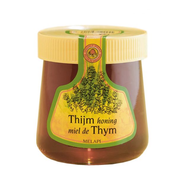 Miel aromatique de thym sauvage, souvent utilisé dans les tisanes expectorantes en combinaison avec des sirops antitussifs.