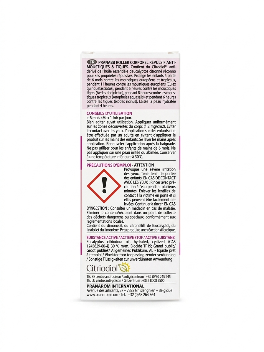 Il est formulé avec du Citriodiol®, un actif dérivé de l'huile essentielle d'eucalyptus citronné. Ce produit offre une protection durable contre les moustiques et les tiques dans les zones tempérées et tropicales. Son format roller de 30 ml permet une application précise et pratique sur le corps.