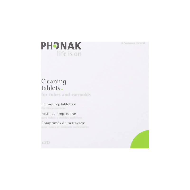 Comprimés de nettoyage pour embouts auriculaires. Le système auditif ne doit jamais être plongé dans le liquide de nettoyage ! Nettoyez les embouts auriculaires 2 x par semaine. Rincez les embouts à l'eau courante après la séance de nettoyage et essuyez ensuite à l'aide d'un chiffon.