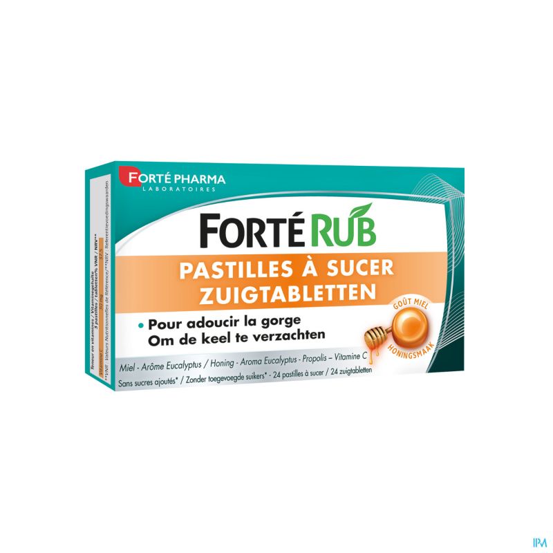 Ingrédients Fortérub Miel (pour 3 pastilles) : Edulcorants (isomalt, maltitol), miel de châtaignier (180 mg), extrait de propolis (105 mg), vitamine C (acide L-ascorbique), arôme d'eucalyptus.