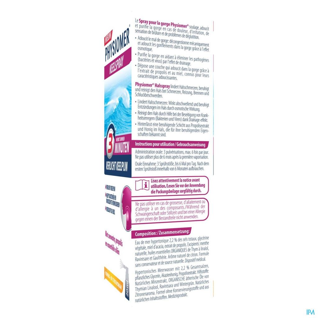 - Le spray pour la gorge, tout comme les sprays pour le nez PHYSIOMER®, est une alternative naturelle à base d'eau de mer. Quelle est la cause d'une gorge irritée? Lorsque la gorge est exposée à des sources d'infection comme des virus et des bactéries, cela peut mener à des inflammations douloureuses comme une pharyngite (inflammation de la gorge) ou une amygdalite (inflammation des amygdales). La réaction inflammatoire se caractérise par une augmentation des liquides et des cellules immunitaires dans la muqueuse. Les cellules immunitaires déclenchent le gonflement de la muqueuse. Les tissus sont mis sous pression et commencent à frotter les uns contre les autres, ce qui provoque des symptômes d'un mal de gorge. Grâce aux propriétés décongestionnantes de l'eau de mer, le liquide excédentaire est éliminé des tissus et le spray pour la gorge agit, de la même manière que les sprays pour le nez PHYSIOMER® pour dégager un nezbouché.