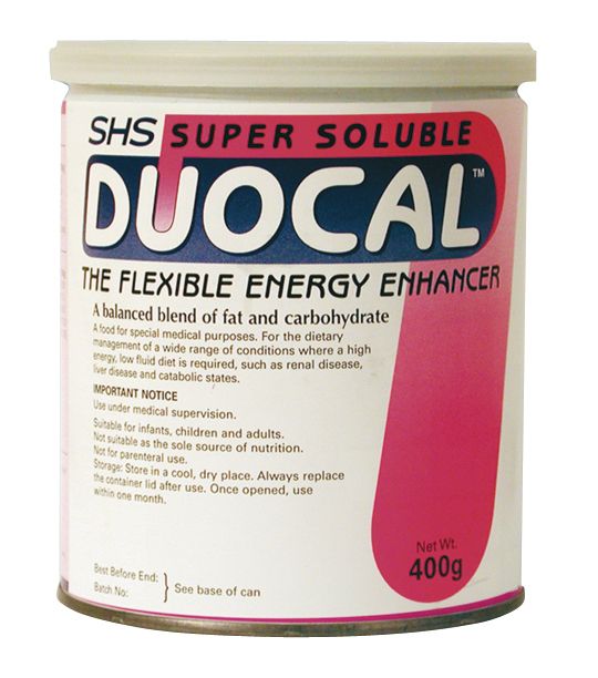 Une boîte contient 400 g de poudre. La dose quotidienne de Duocal doit être déterminée par le médecin ou le diététicien et dépend de l'âge, du poids et de la condition médicale du patient. Duocal est vendu en pharmacie.