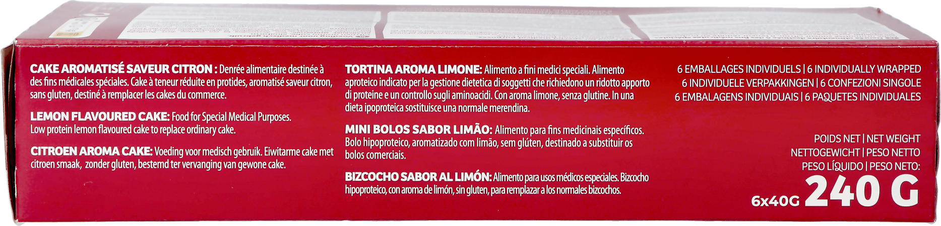 Aliment destiné à des fins médicales spéciales. Gâteau parfumé au citron, pauvre en protéines et sans gluten, pour remplacer les gâteaux ordinaires.