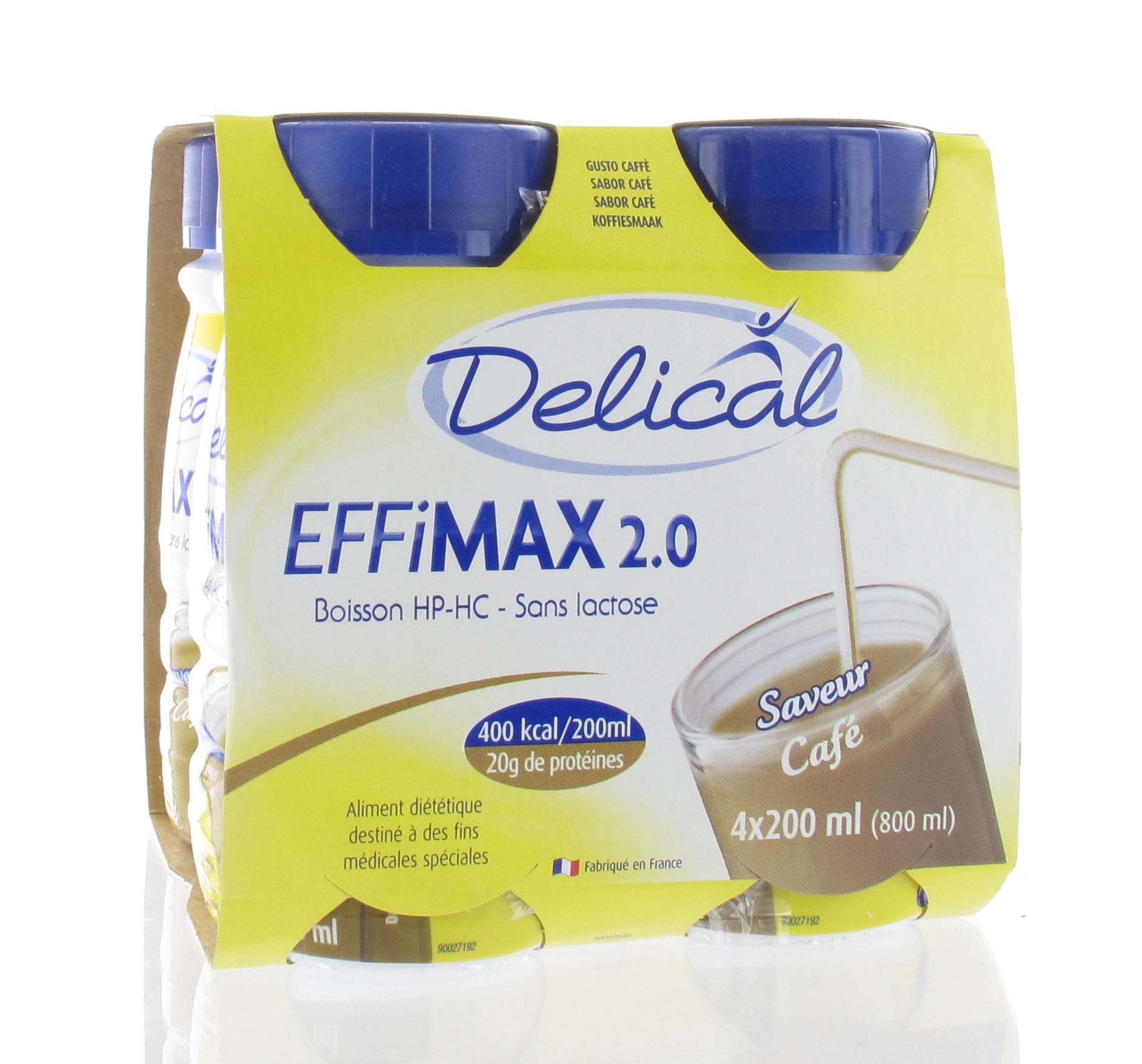Delical Effimax 2.0 est un aliment diététique destiné à des fins médicales spéciales hyperprotidique et hypercalorique. Il ne contient pas de lactose. Cet aliment a une saveur de café.