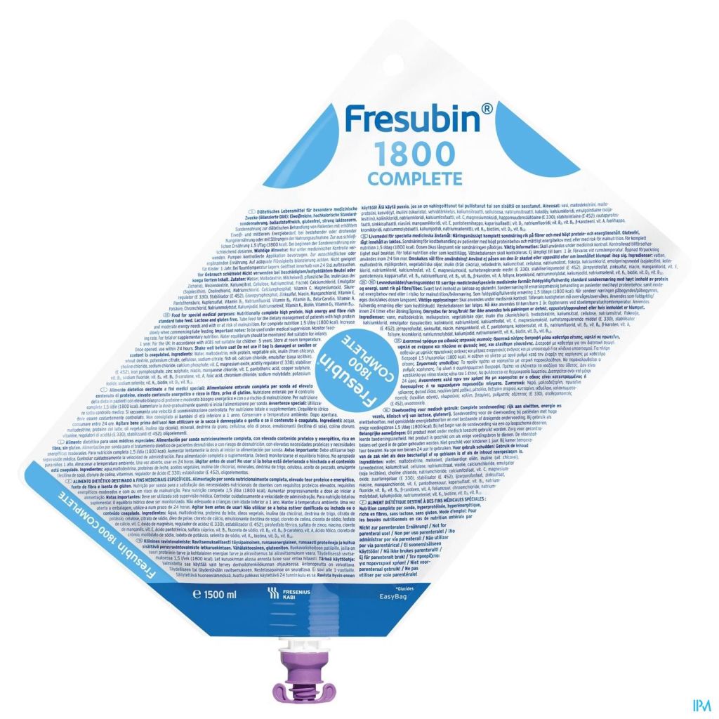 Alimentation complète par sonde, hypercalorique (1,2 kcal/ml) et hyperprotéinée (20% AET), avec huile de poisson et avec fibres. Pour couvrir les besoins nutritionnels en cas de nutrition entérale par sonde des patients dénutris ou à risque de dénutrition ayant des besoins protéiques accrus et des besoins énergétiques plus modérés. Sans gluten et cliniquement sans lactose.