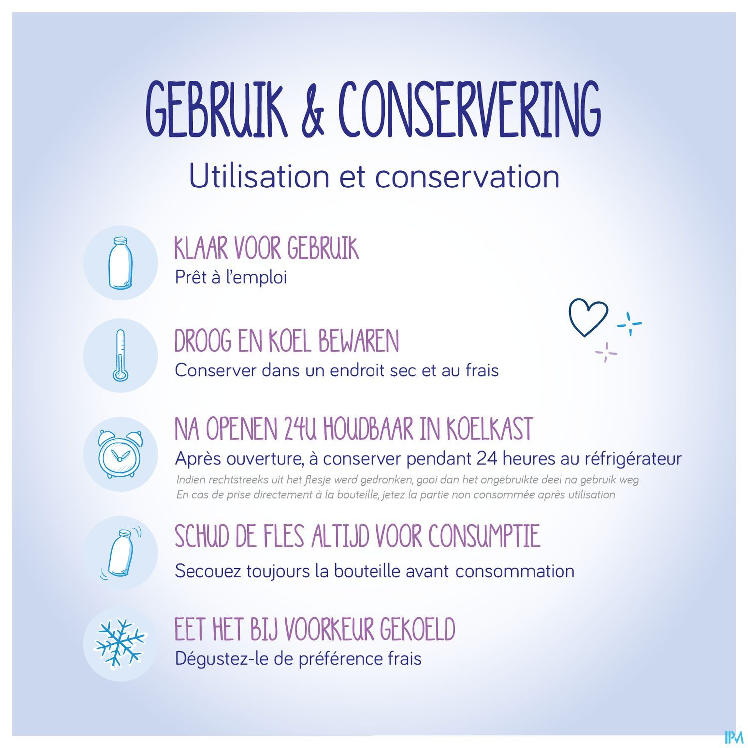 - Format Compact : permet d'obtenir en moins de gorgées les mêmes apports nutritionnels qu'une bouteille de 200 ml