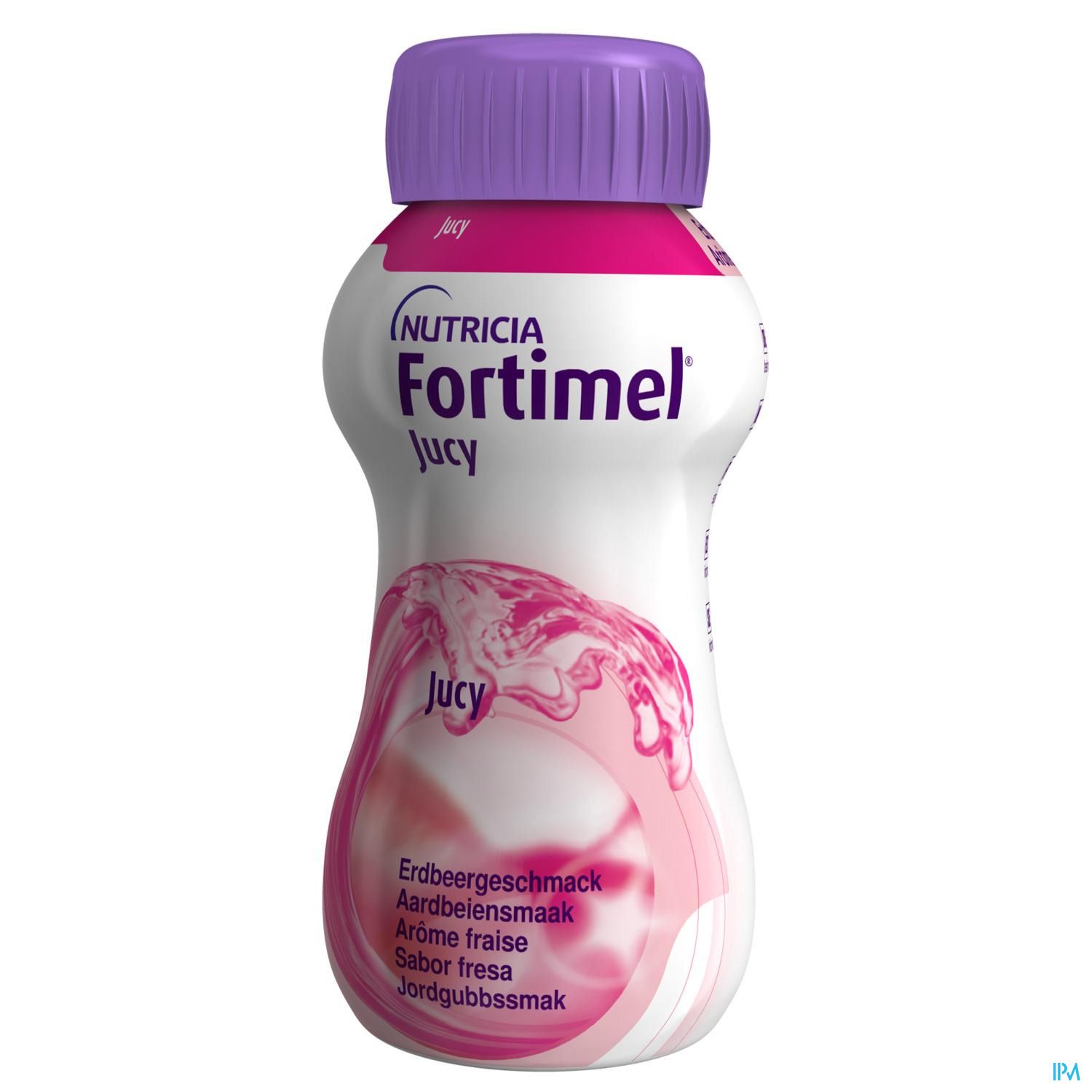 Eau, sirop de glucose, dextrine-maltose, isolat de protéines de lactosérum (de lait de vache), sucre, arôme, correcteur d'acidité (acide citrique), chlorure de choline, chlorure de calcium, acide L-ascorbique, colorant (anthocyanes), chlorure de potassium, lactate ferreux, chlorure de sodium, chlorure de magnésium, colorant (caramel au sulfite d'ammonium), sulfate de zinc, acétate de DL-α-tocophérol, gluconate de cuivre, D-pantothénate de calcium, nicotinamide, chlorhydrate de thiamine, palmitate de rétinol, sulfate de manganèse, fluorure de sodium, chlorhydrate de pyridoxine, riboflavine, acide ptéroylmonoglutamique, chlorure de chrome, iodure de potassium, phytoménadione, molybdate de sodium, sélénite de sodium, D-biotine, cholécalciférol, cyanocobalamine.