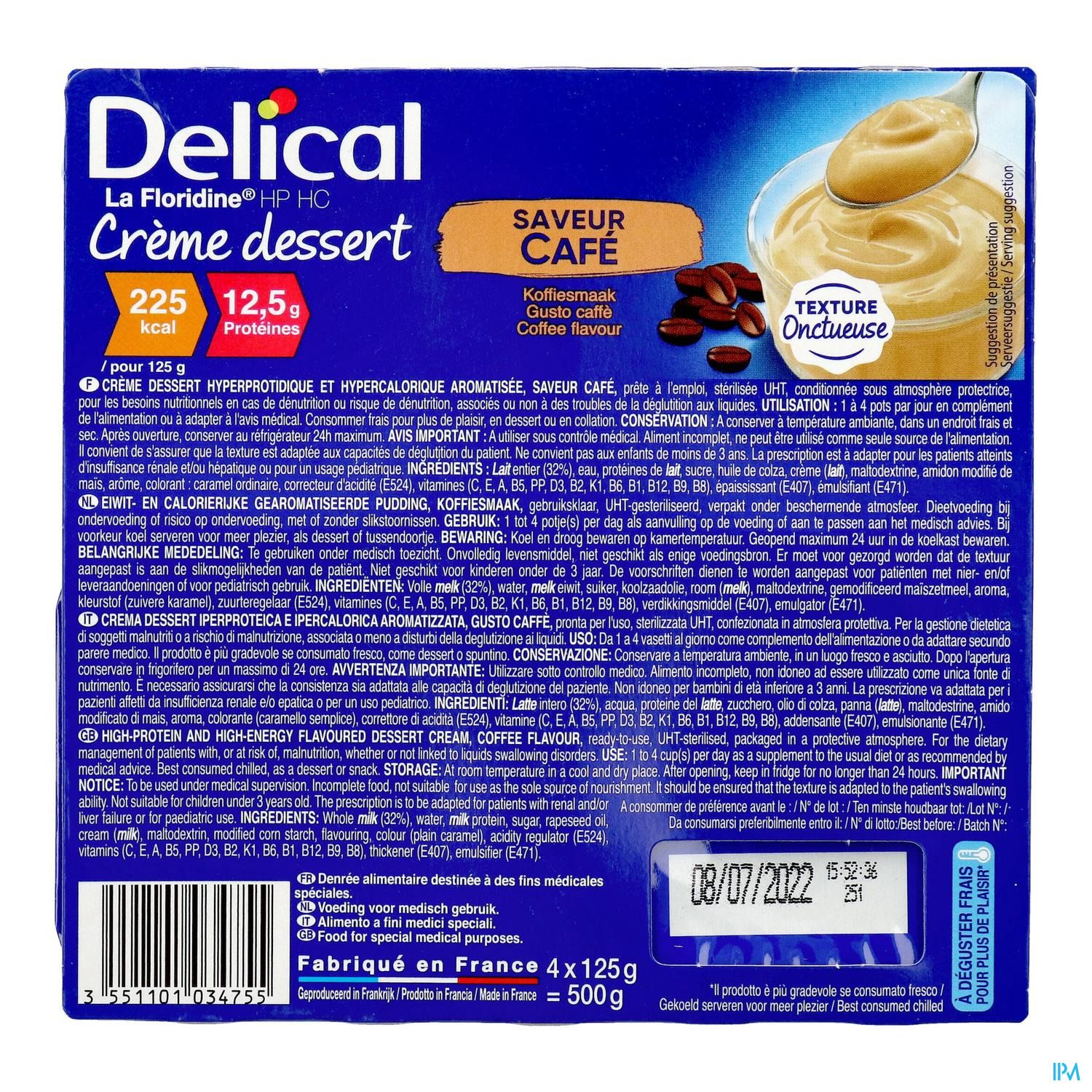Crème dessert lactée, Hyperprotidique, Hypercalorique, aromatisée. Prête à l'emploi, stérilisée UHT.