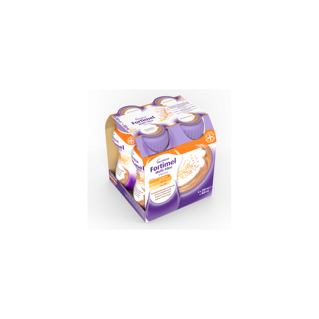 Eau, dextrine-maltose, protéines de LAIT de vache, sacharose, huiles végétales (colza, tournesol), fibres alimentaires (inuline, oligofructose, amidon résistant, polysaccharides de SOJA, gomme arabique, cellulose), cacao, arôme, émulsifiant (lécithine de SOJA), correcteur d'acidité (acide citrique), citrate de potassium, chlorure de magnésium, hydroxyde de calcium, chlorure de choline, caroténoïdes (contient SOJA)(b-caroteen, lutéine, oléorésinde de lycopène de tomate), orthophosphate di-potassique, phosphate tri-calcique, L-ascorbate de sodium, stabilisant (carraghénanes), hydroxyde de potassium, citrate de sodium, chlorure de potassium, lactate ferreux, sulfate de zinc, nicotinamide, acétate de rétinol, gluconate de cuivre, acétate de DL-α tocophérol, sélénite de sodium, sulfate de manganèse, D-pantothénate de calcium, chlorure de chrome , D-biotine, cholécalciférol, chlorhydrate de thiamine, acide ptéroylmonoglutamique, chlorhydrate de pyridoxine, cyanocobalamine, molybdate de sodium, fluorure de sodium, riboflavine, iodure de potassium, phytoménadione.