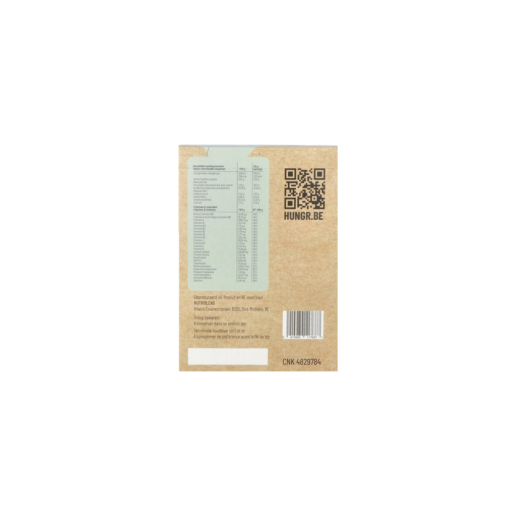 Farine d'avoine (contient du gluten), isolat de protéines de pois, farine de coco, sucre, huile de lin en poudre, poudre de myrtille, citrate tripotassique, colorant : rouge de betterave (Beta vulgaris), arôme naturel, citrate de magnésium, carbonate de calcium, épaississant : gomme xanthane, concentré de jus de carotte noire (Daucus carota L.), chlorure de sodium, régulateur d'acidité : phosphate monopotassique, édulcorant : glycosides de stéviol provenant de la stévia, mélange de vitamines/minéraux.