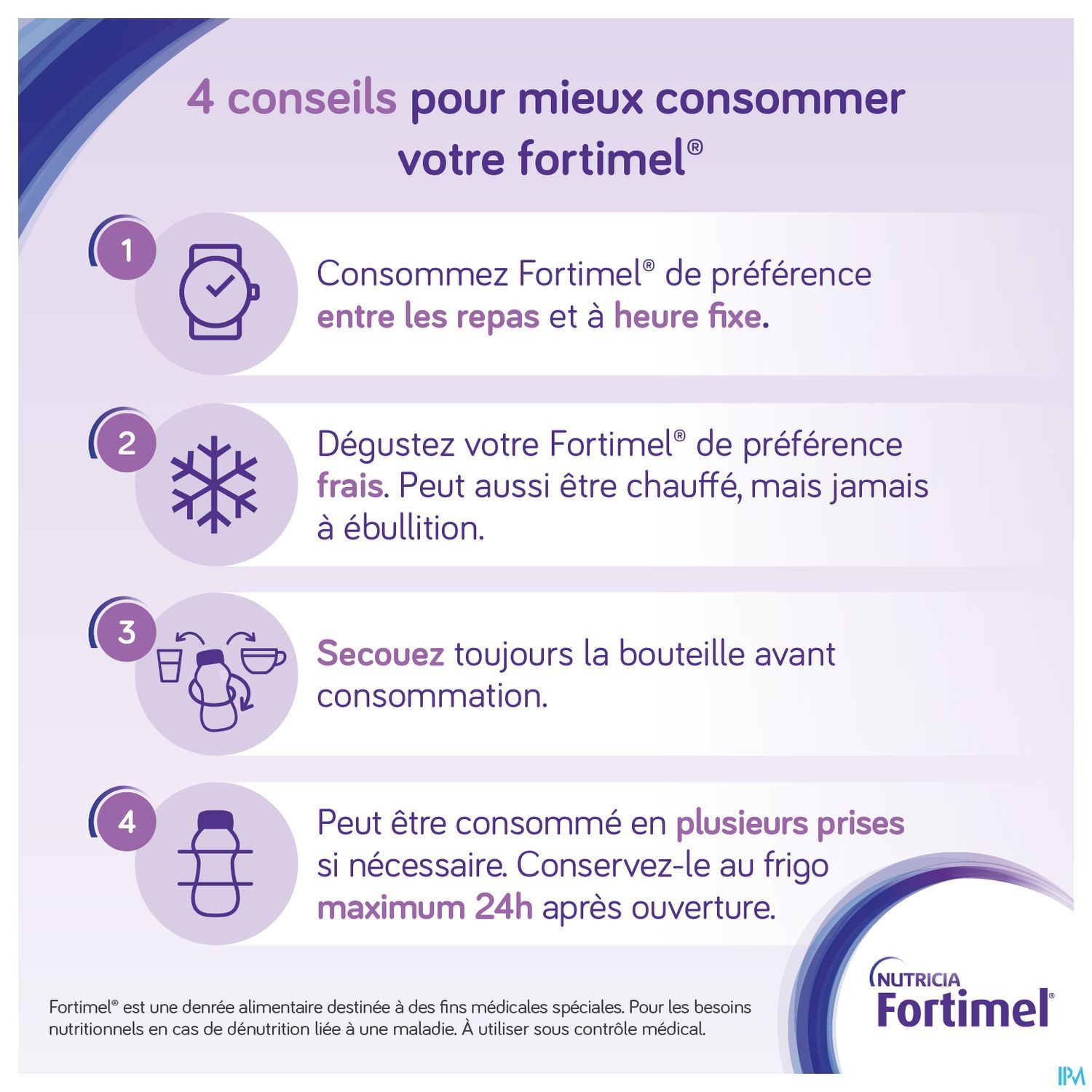 Usage entéral exclusif. À utiliser sous contrôle médical. Ne convient pas comme seule source d'alimentation. Ne convient pas aux enfants de moins de 6 ans. À utiliser avec précaution chez les enfants âgés de 6 à 10 ans. Ne convient pas aux patients atteints de galactosémie. À utiliser avec précaution chez les patients atteints d'insuffisance rénale. Assurer un apport hydrique suffisant.